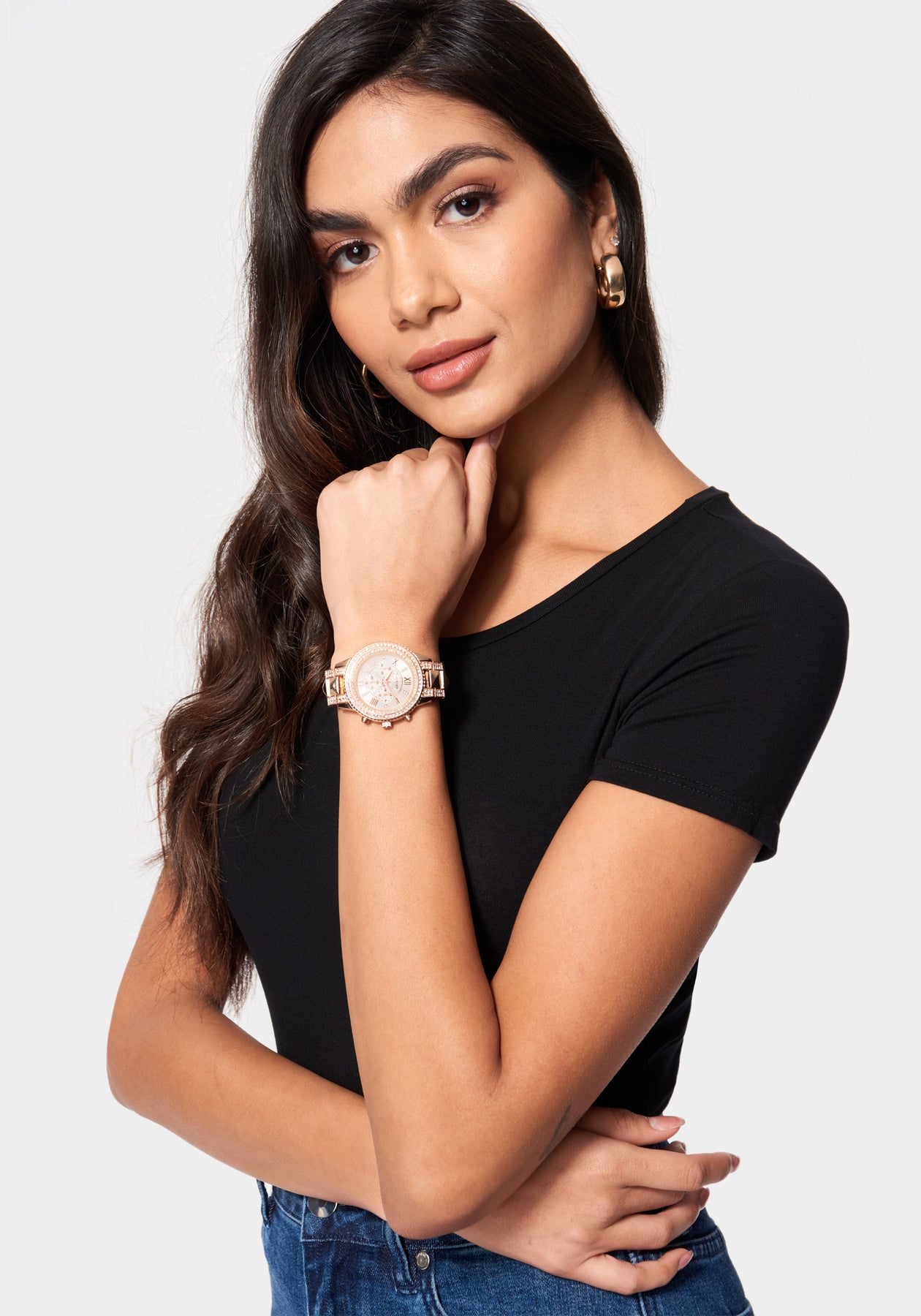 Bold and makes a statement, this watch has a pyramid detail on the strap and a double rhinestone detail around the face.