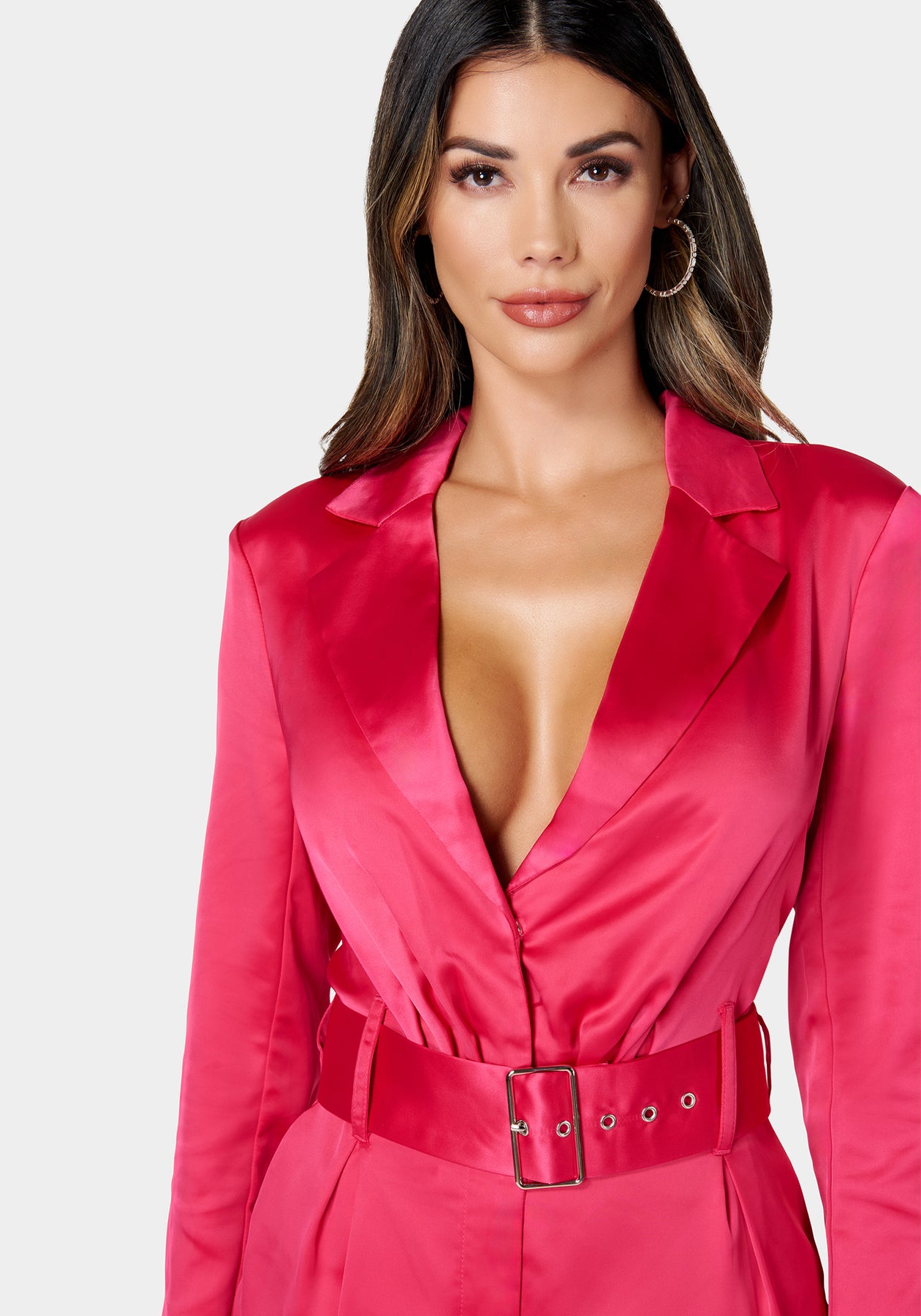 Embrace the elegance of the satin blazer romper. This piece combines the sophisticated look of a blazer with the playful charm of a romper, all in luxurious satin. Chic and versatile, it's a distinctive addition to your fashion arsenal, effortlessly bridging the gap between formal wear and casual comfort. The satin blazer romper personifies modern style with a twist.