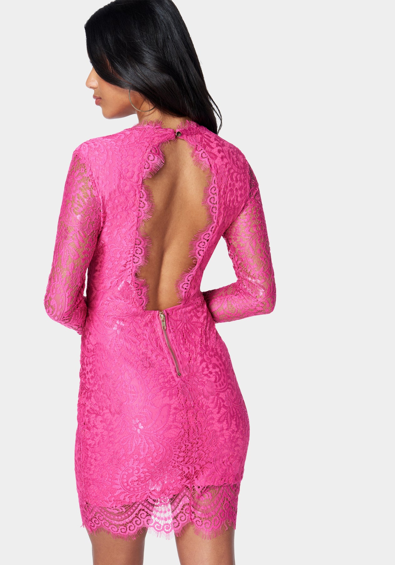 Sheer elegance. This dress features a scalloped lace neckline, sheer sleeves, fitted bodice, and a flared mini skirt. Finished with an open back design, this style adds a touch of edgy sophistication to your look.