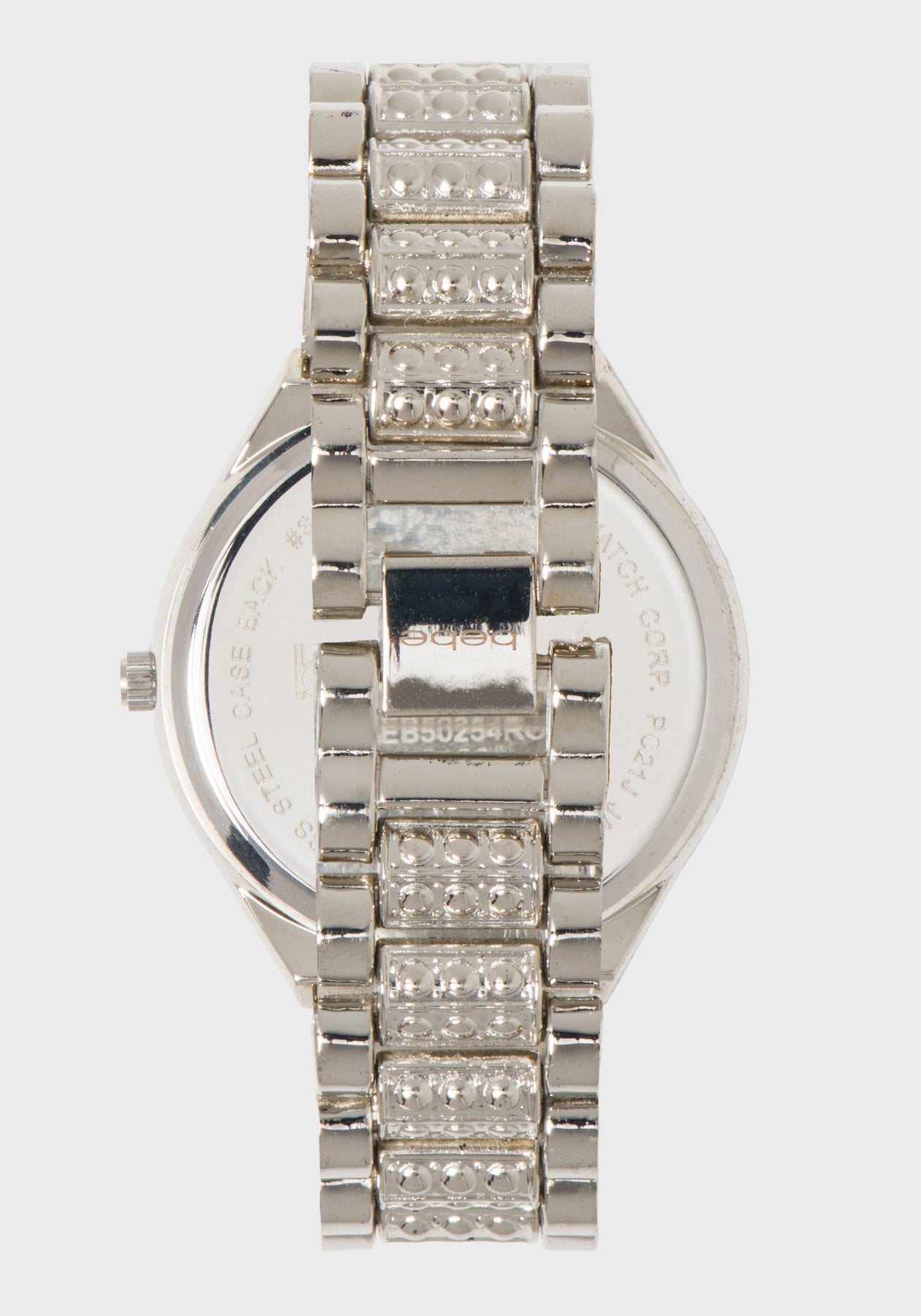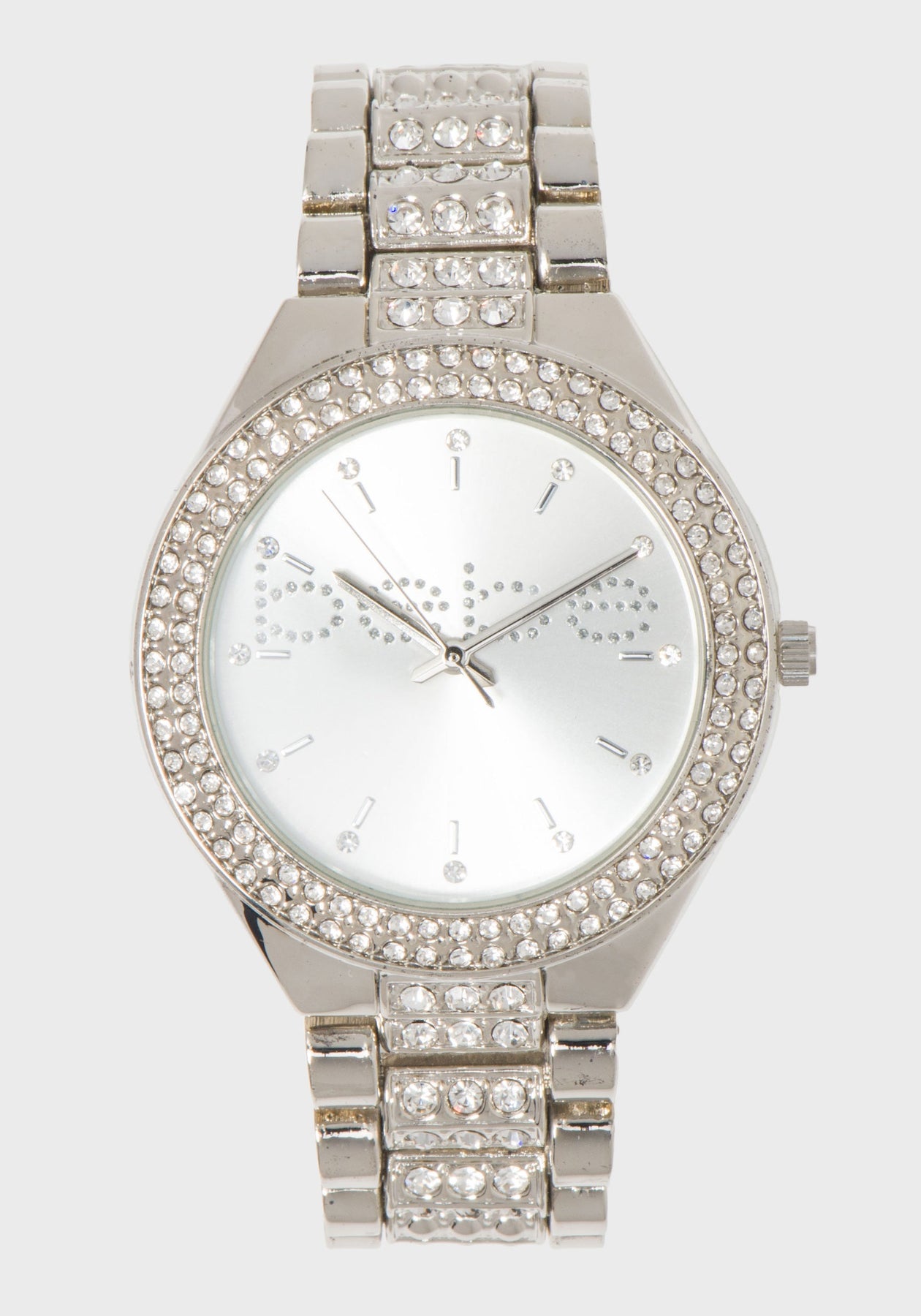 Right on trend for this season, this new crystal link bracelet comes with a double row crystal bezel. Features a silver textured dial with a crystal embossed iconic logo that feels both luxurious and modern.