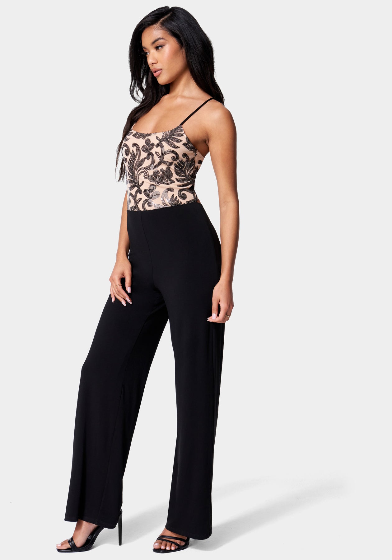 Give your LBD a night off and opt for this wide-legged Sparkle Mesh Jumpsuit. Featuring a strappy back that makes for a seductive exit.