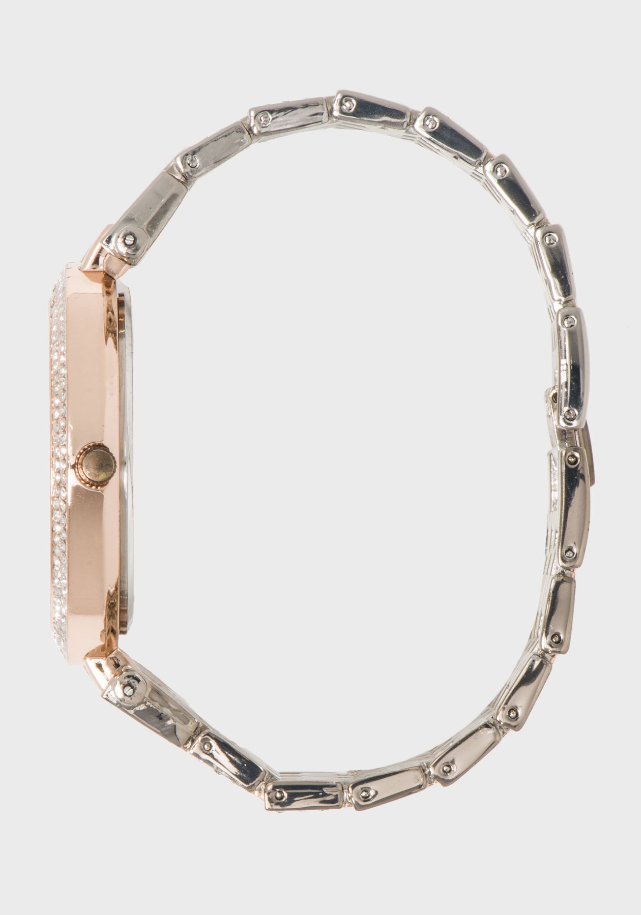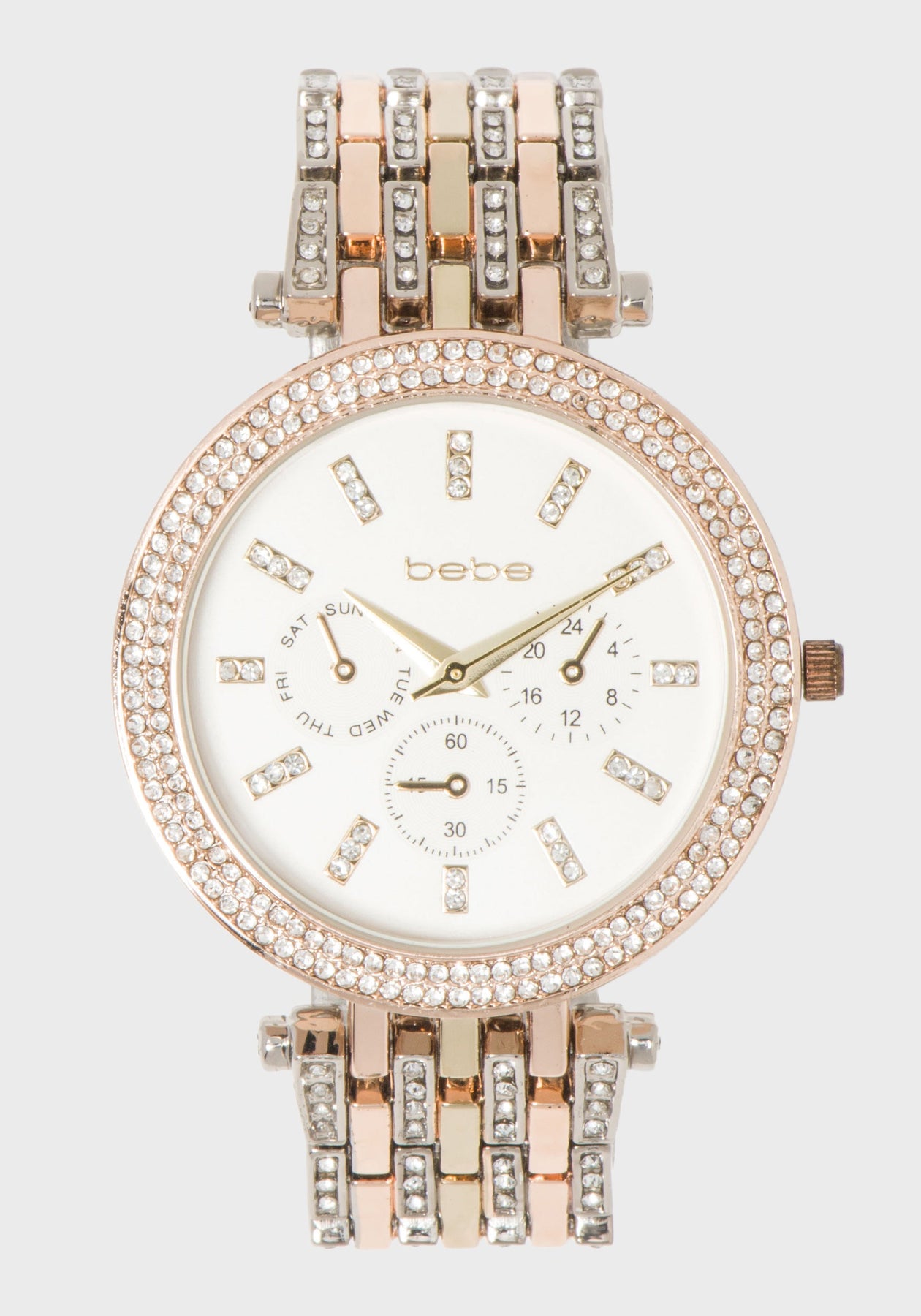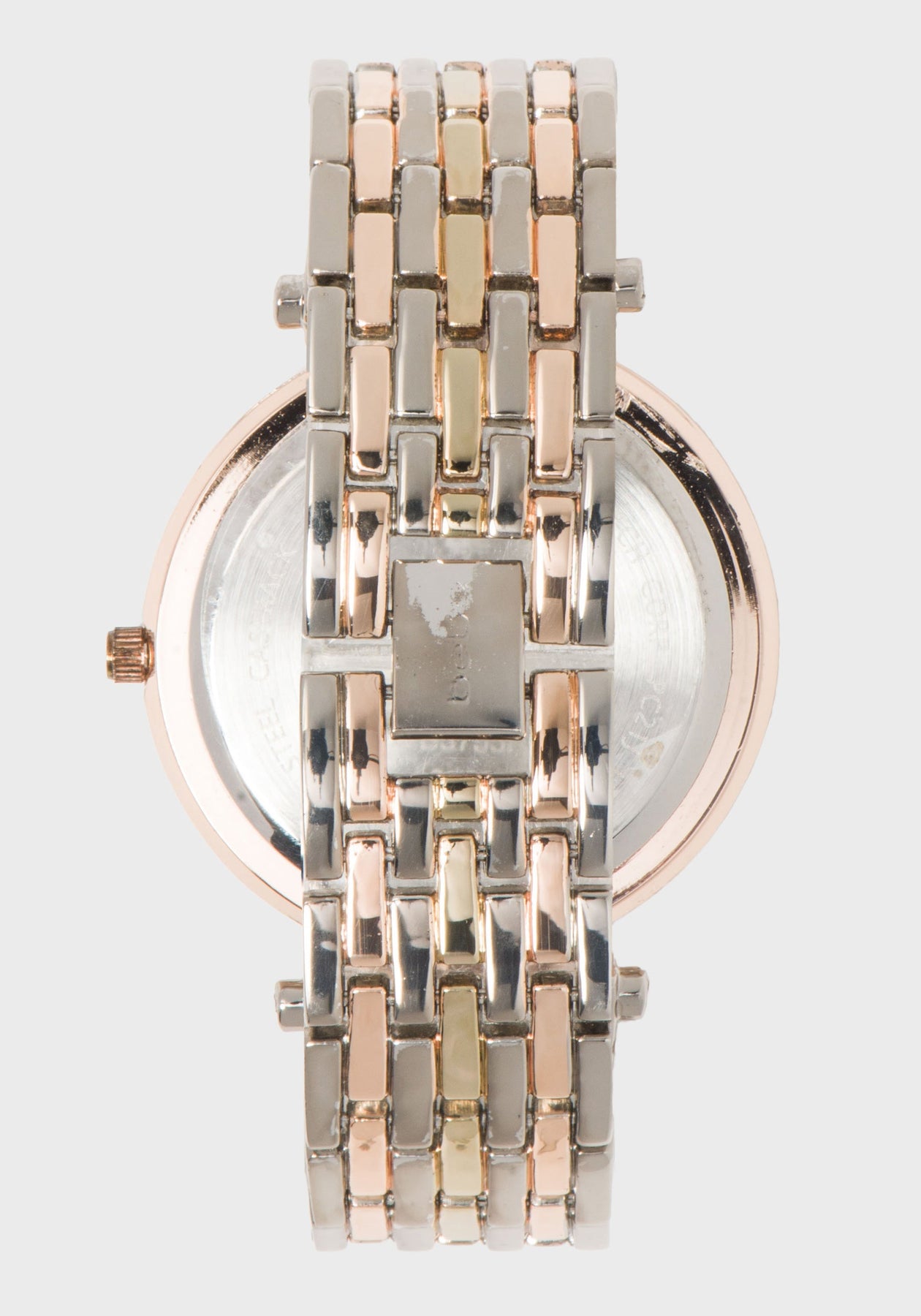 A mix of modern and classic designs, this sleek watch features tri-tone platings and crystal bezel. The perfect addition to your accessory lineup, this watch will quickly become a part of your everyday outfit.