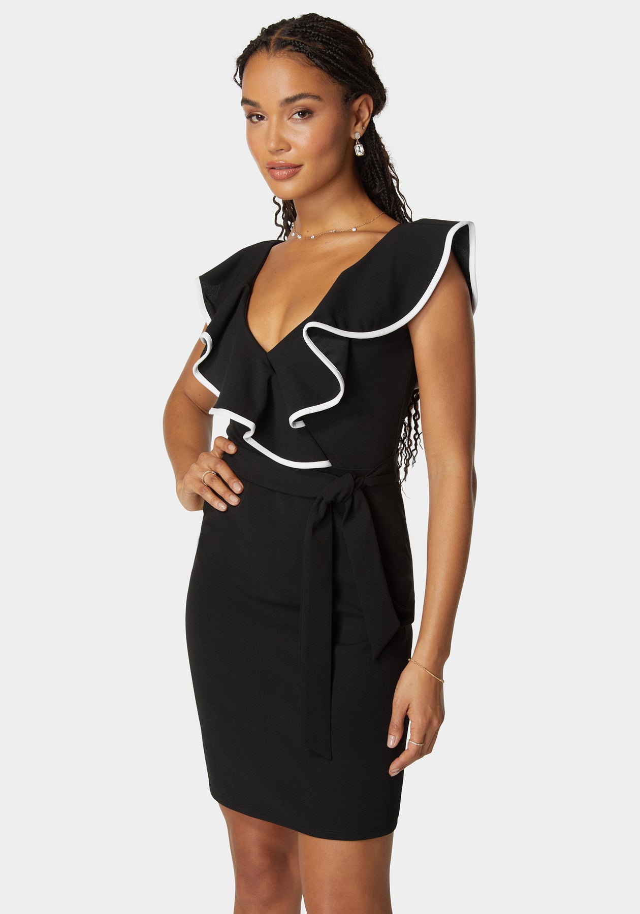 Slip into this Bebe V Neck Flutter Dress to make a statement at every event on your social calendar! It features a ruffled neckline, tie-waist, and bodycon silhouette to show off your flattering figure.