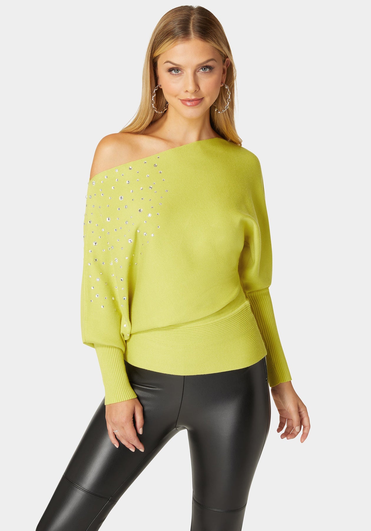 Make a bold statement with this off-shoulder sweater adorned with studs. The dolman sleeves add a touch of allure, ideal for a concert night or a flirty drink date.