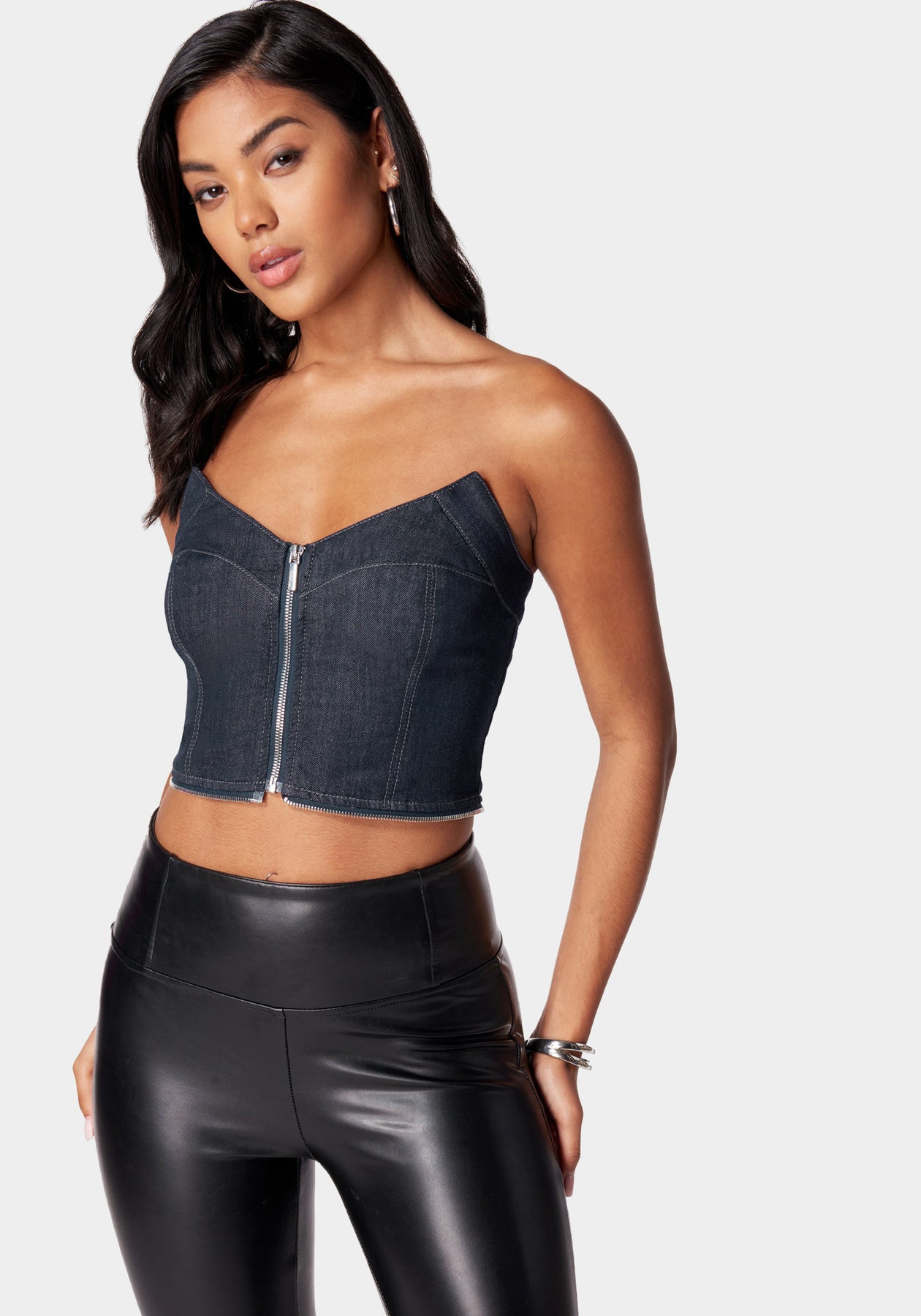 Dare to be bold in our removable peplum zip front denim bustier. The perfect blend of style and versatility, this bustier features a zip front design that adds a modern touch, while the removable peplum adds a flirtatious and ultra-feminine touch.