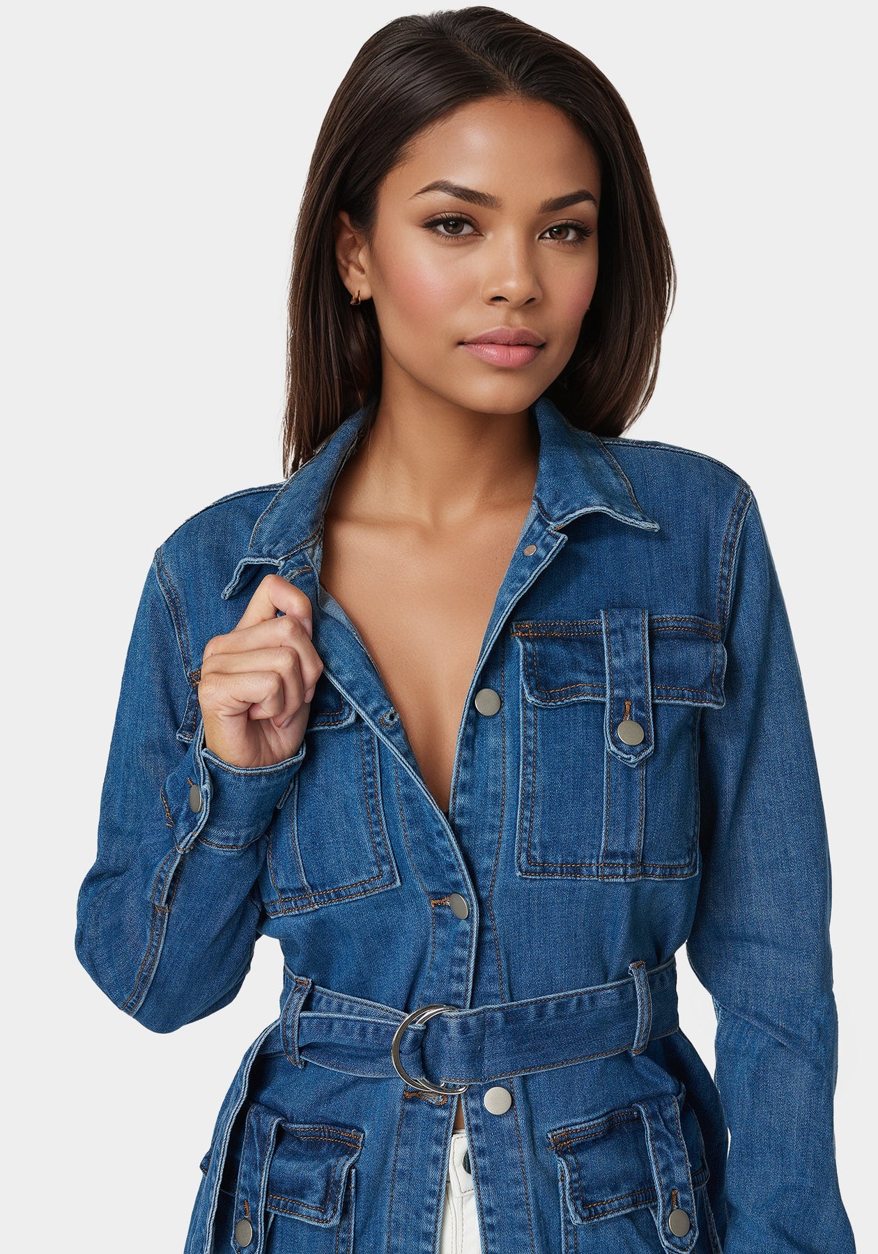 Embrace a sultry and chic style with our Semi-Fitted Utility Denim Jacket. The semi-fitted silhouette accentuates your curves, while the utility details add a touch of edge. With a confident stride, you'll turn heads and make a statement with your irresistible charm.