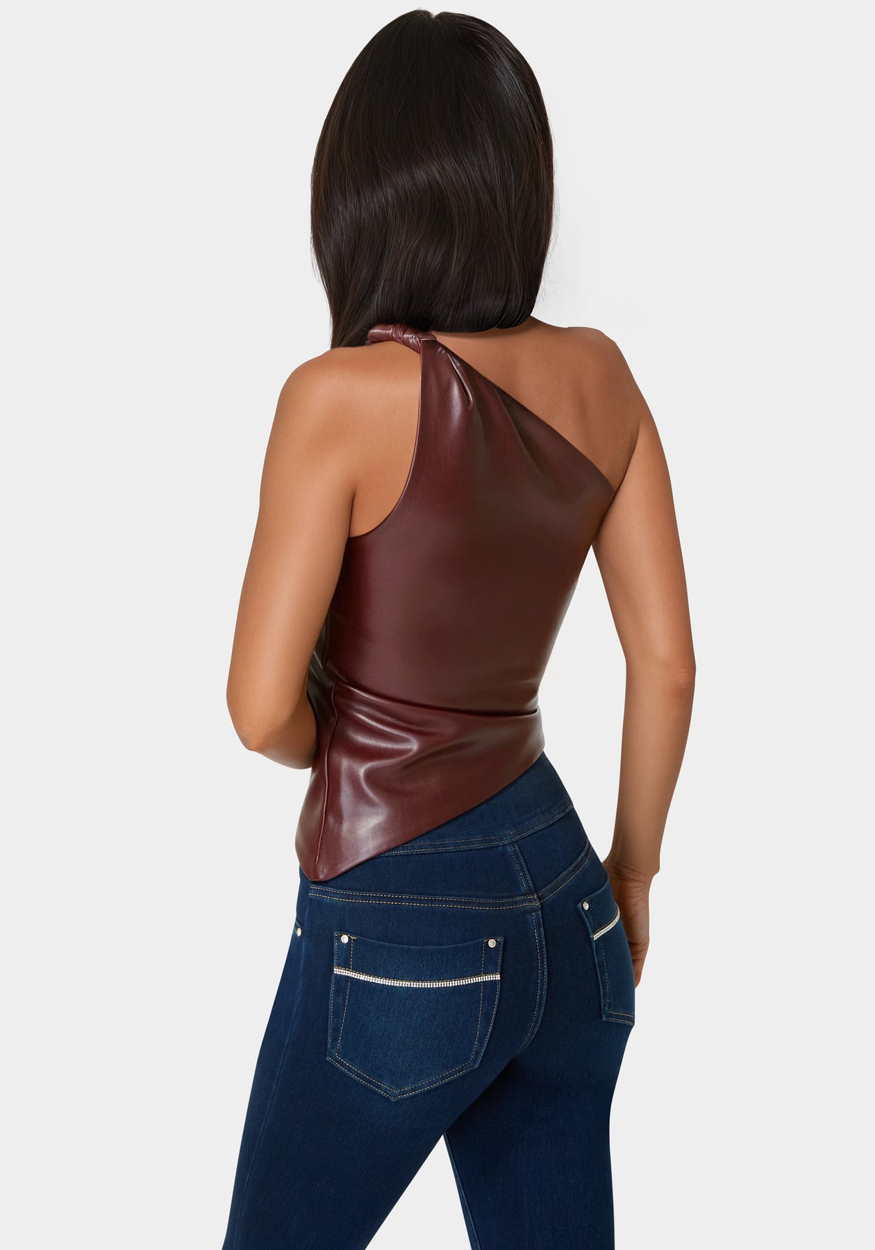 Elevate your look with this vegan leather one-shoulder top; perfect for chic events or stylish nights out.