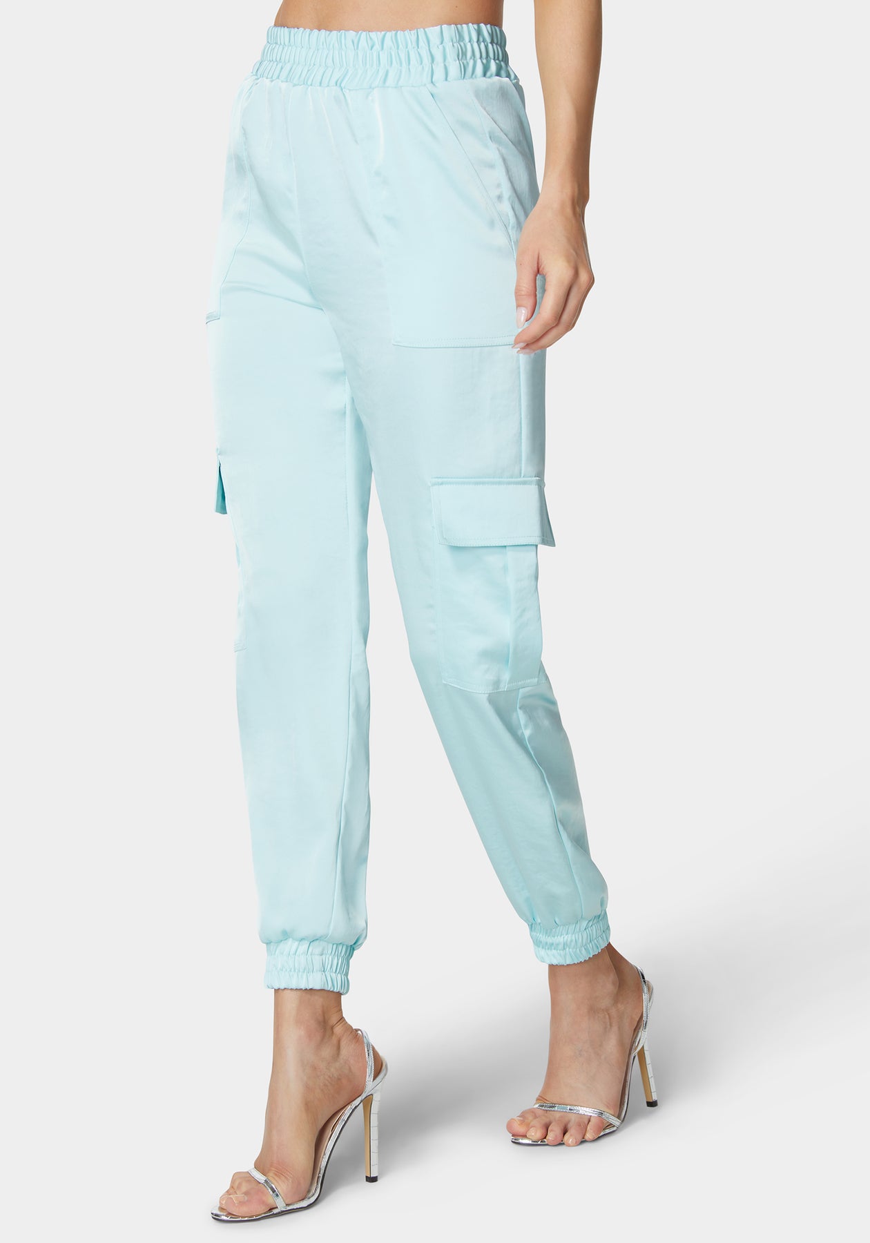 Laundered Satin Elastic Waist Cargo Jogger Pant