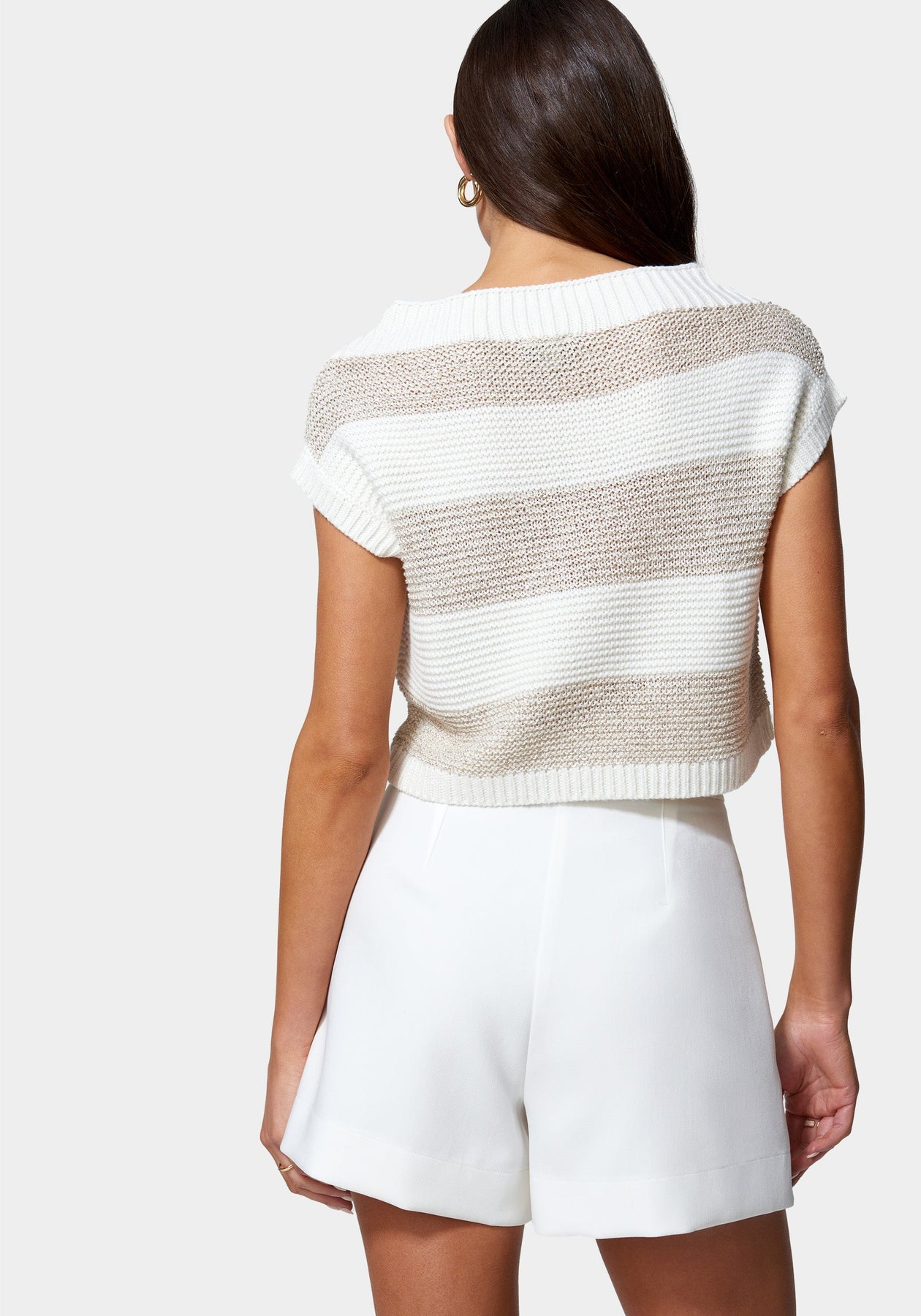 The knit your closet needs. This soft knit sweater features a dropped shoulder, boat neckline, and a timeless striped motif with sequin details. Pair with tailored pieces for a polished look.