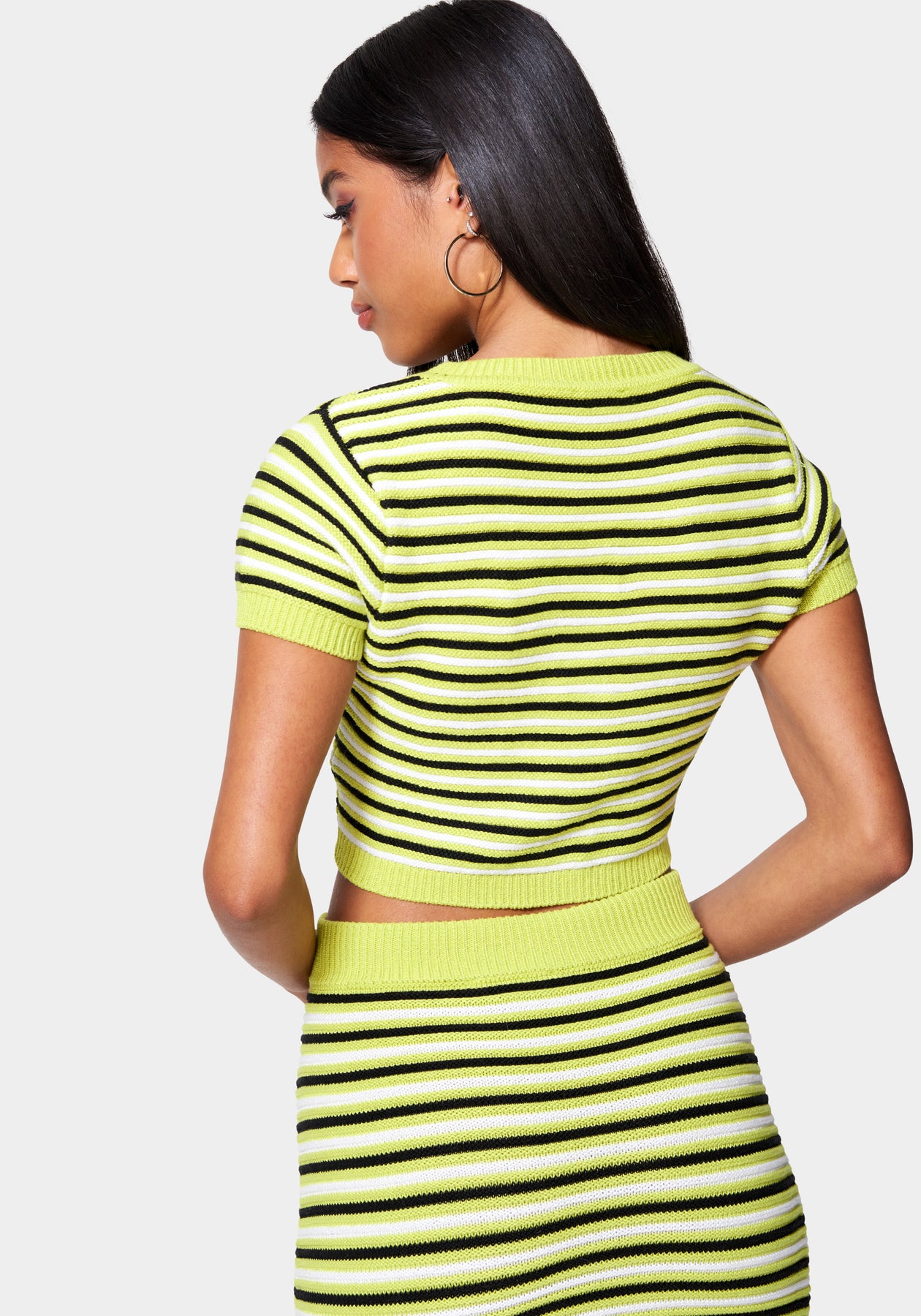 Cute and cropped. This striped knit cardigan sweater features a button front, short sleeves, and chest pockets for a flirty yet sporty feel. Pair with the High Waist Pencil Sweater Skirt for a matching look.