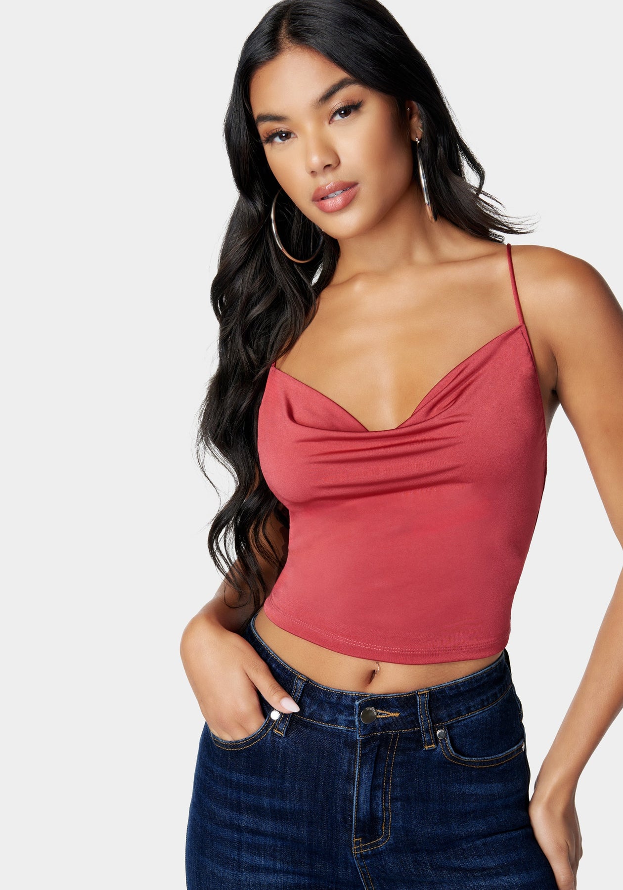 This on-trend piece boasts a beautifully draped neckline and a sophisticated crisscross back design, all enveloped in a lustrous satin effect knit.