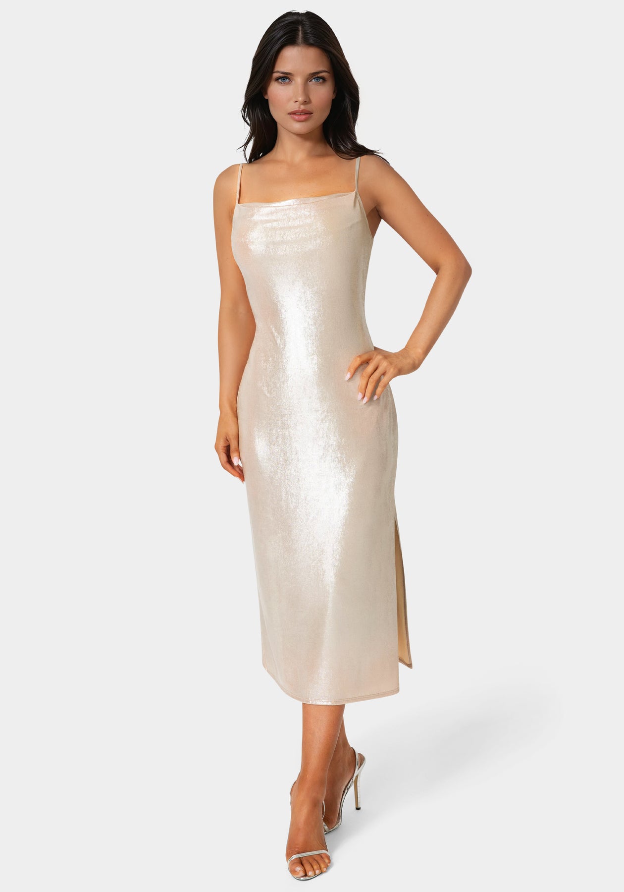 Metallic shine, draped cowl neckline, and a slinky fit that moves like trouble. Wear it to NYE, birthday blowouts, and nights with a guest list.