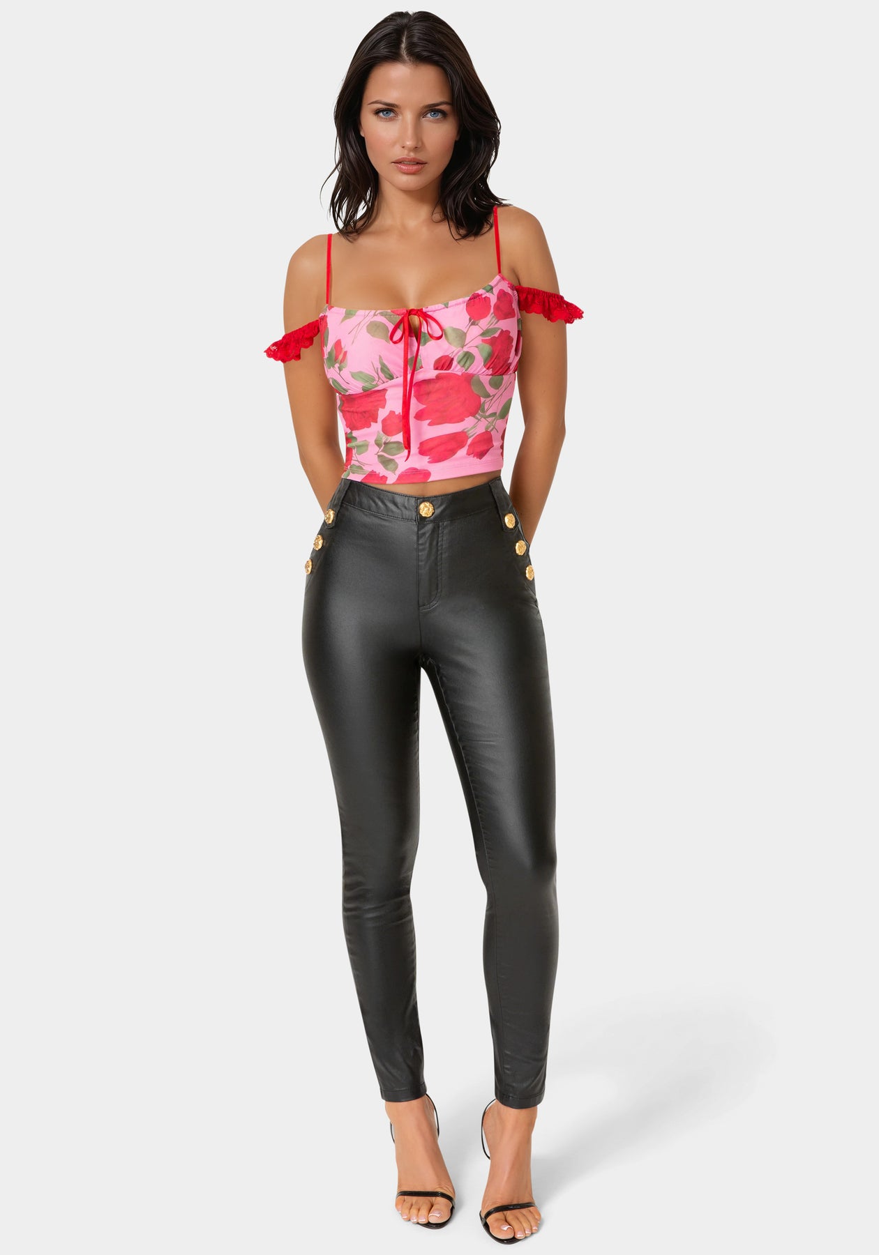 Natural waist coated skinny jeans with a sleek finish, gold hardware, and second-skin fit. Wear with strappy heels for night shows, oversized tees for concerts, and blazers for mischievous meetings.