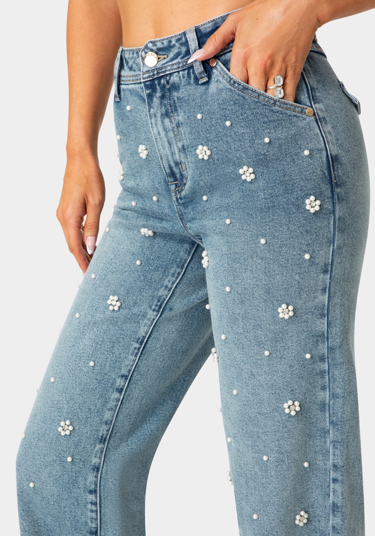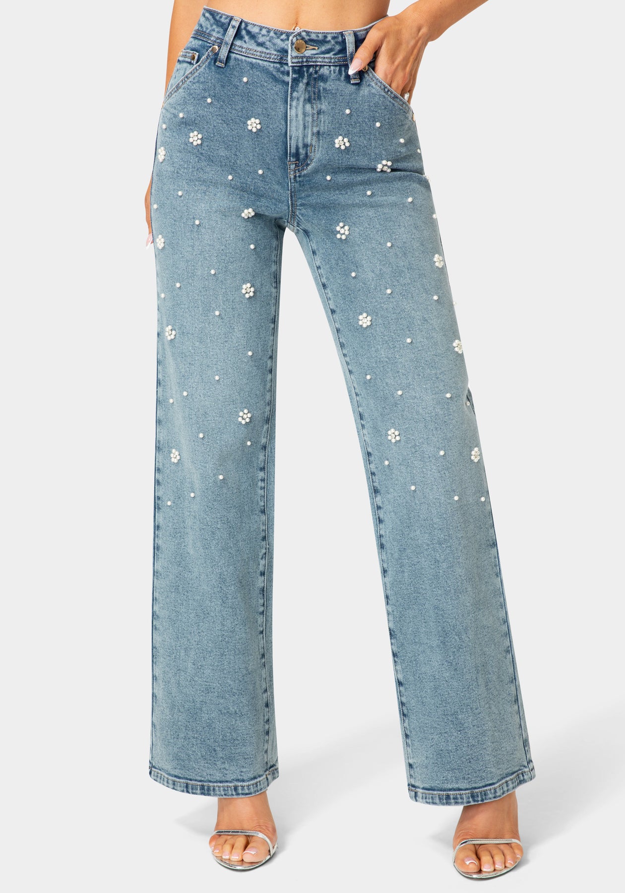 Natural waist embellished wide leg jeans in stretch denim with pearl and rhinestone hits and gold hardware. Pair with a corset top for brunch gossip, gallery strolls, and after-dark dance floors.
