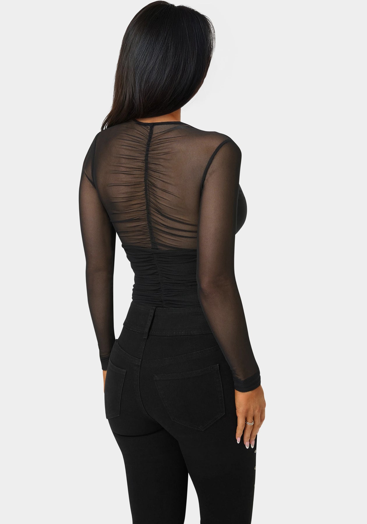 This shirred mesh bodysuit provides a fashionable edge; perfect for nights out or dynamic social settings.