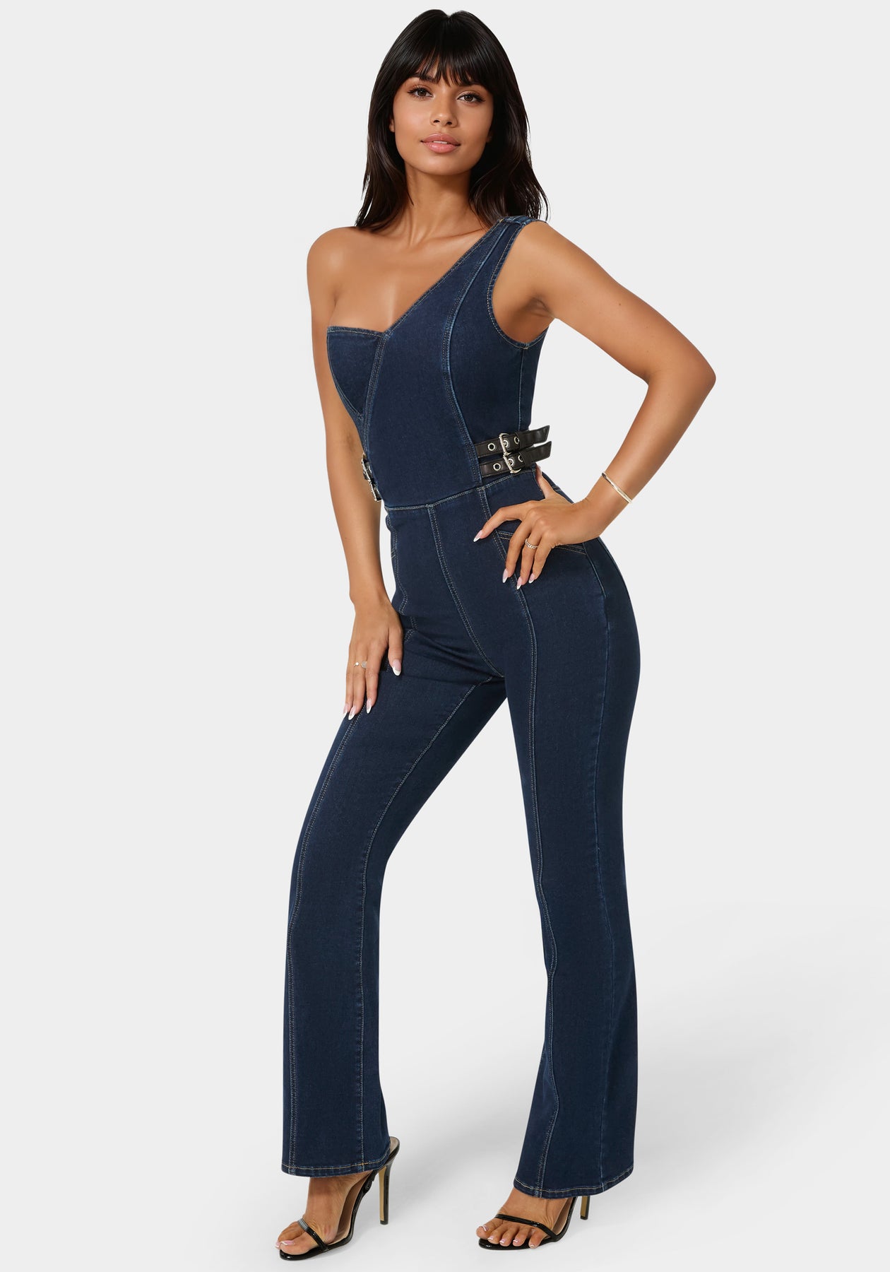 A one-shoulder design with straight flare legs gives this denim jumpsuit a standout look for any event.