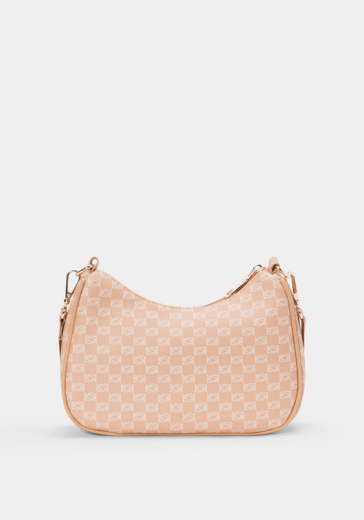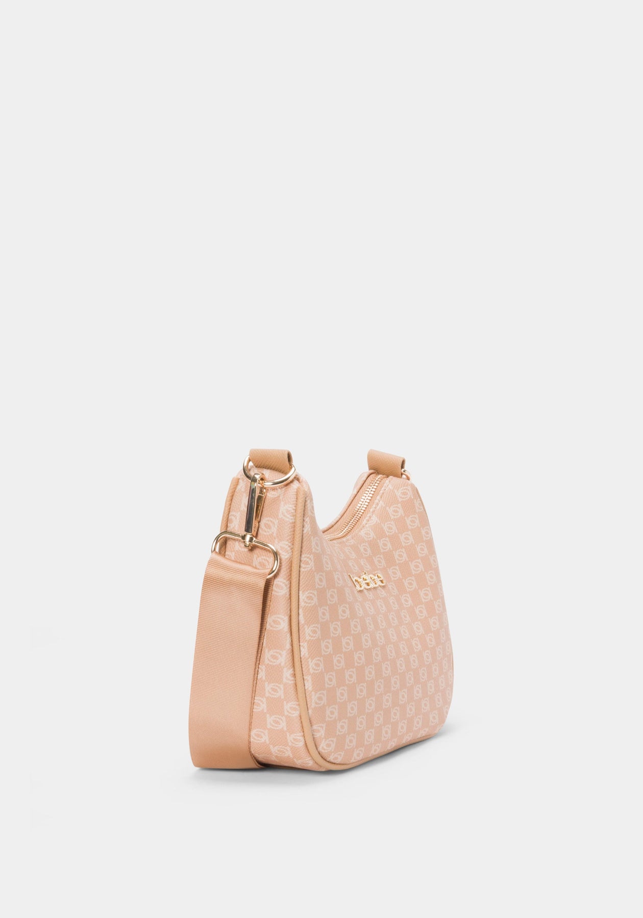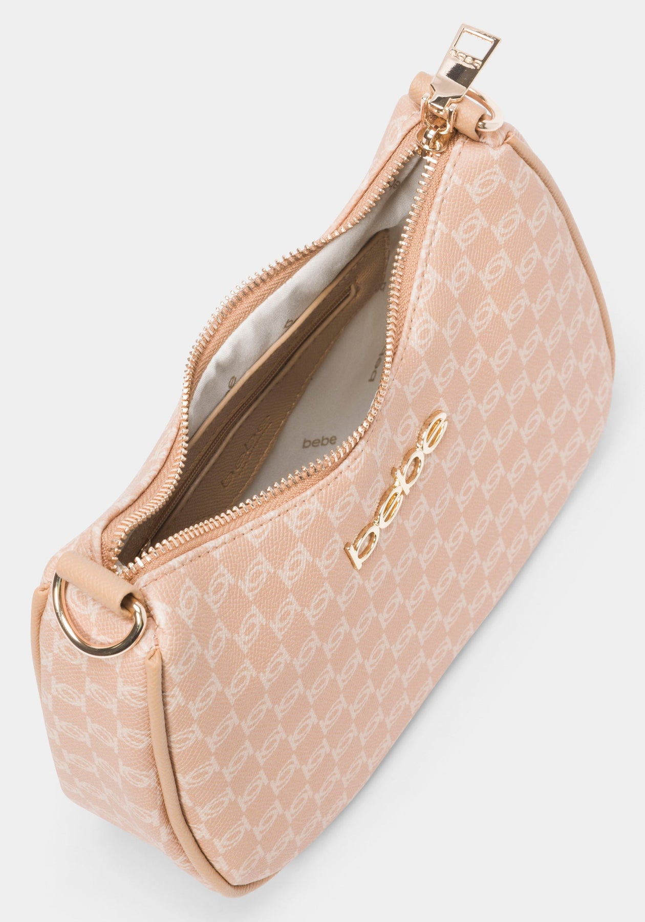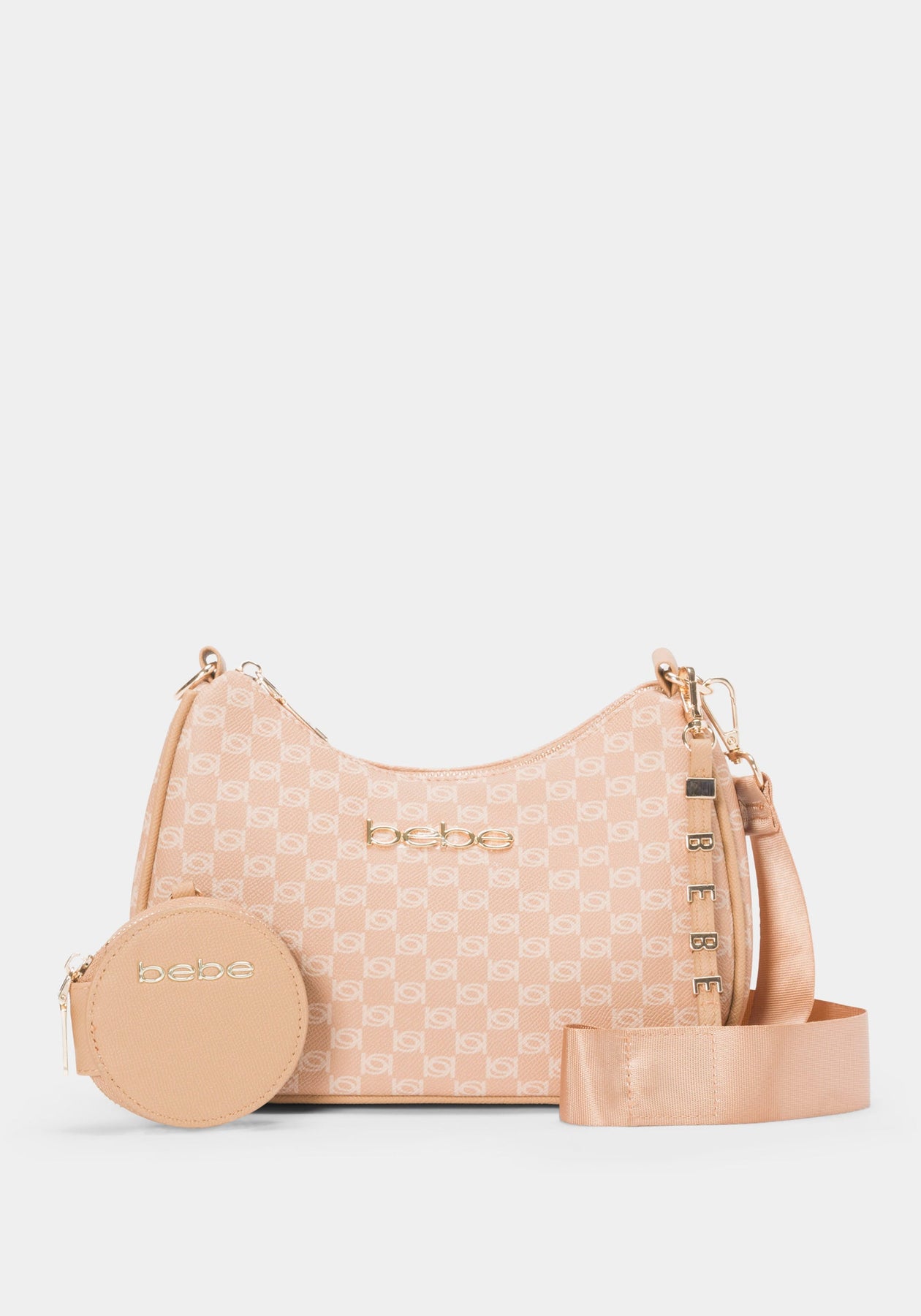 Stylish and functional, this monogram crossbody includes gold hardware, a Bebe logo keychain, and a removable coin purse for added utility.