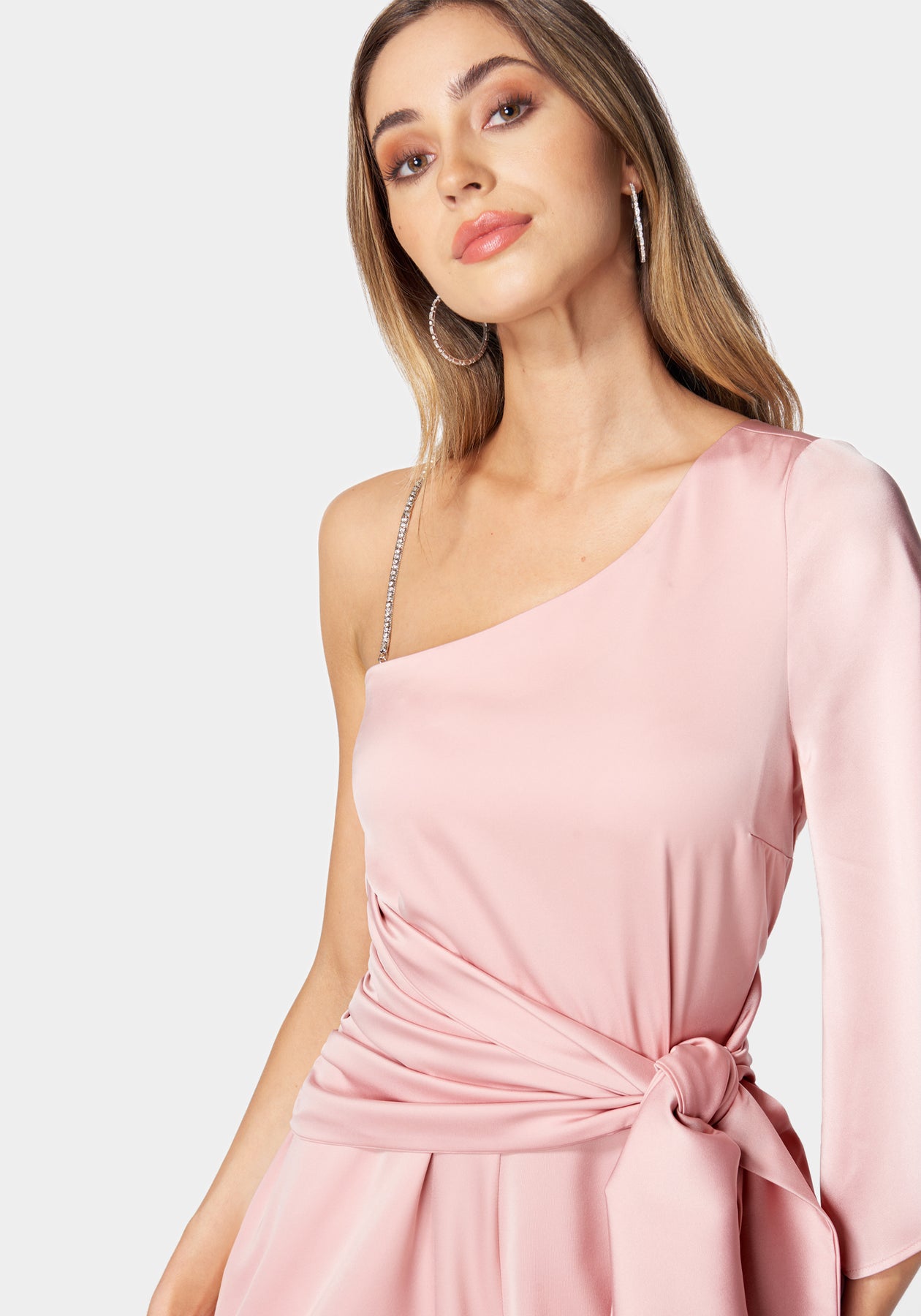 Asymmetric Sleeve Rhinestone Strap Satin Romper