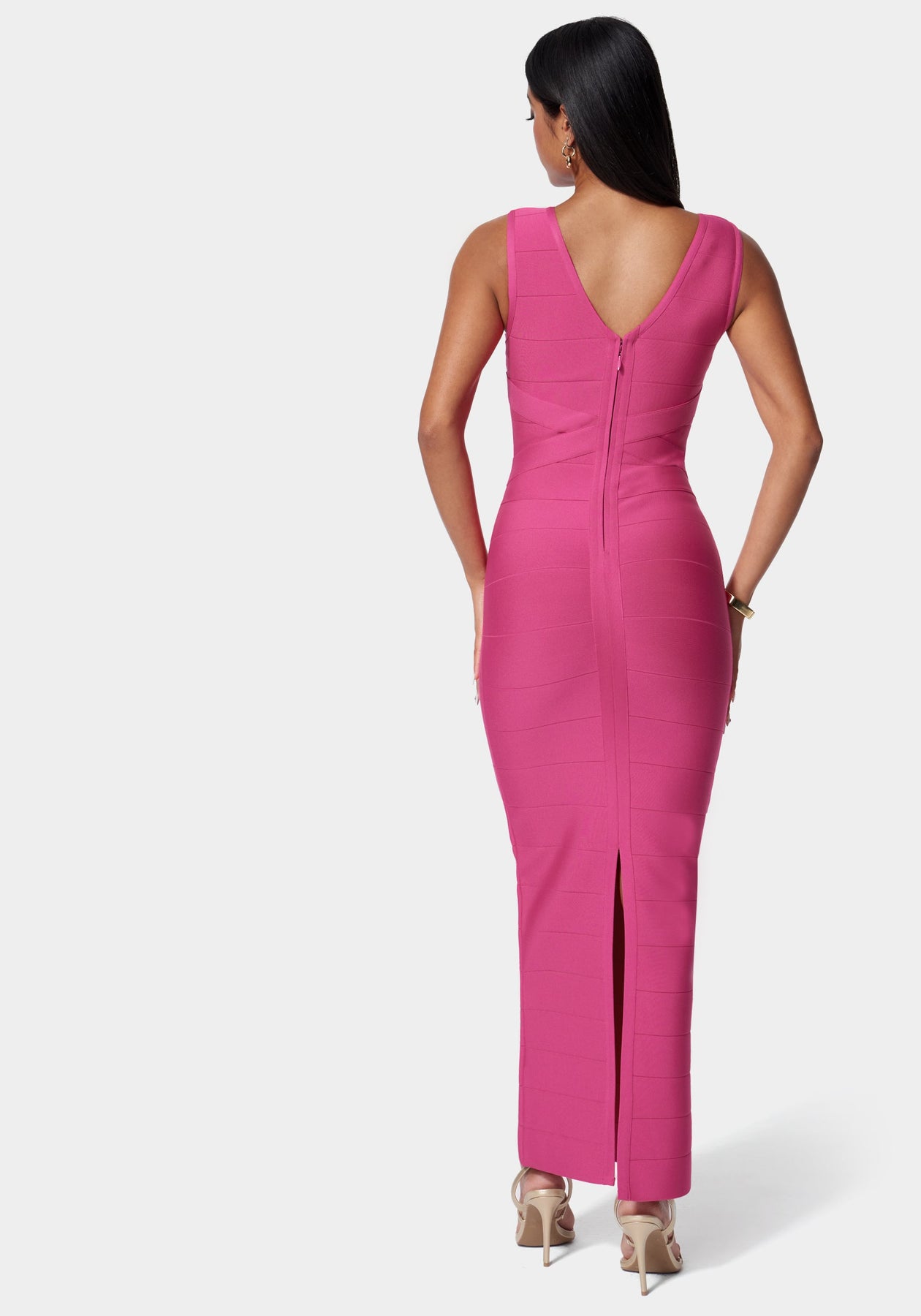 It's giving Hollywood glamour. Defined in a curve-hugging fit, this floor-length bandage dress features sexy crossover details, double V silhouette, and a flattering back slit hem.