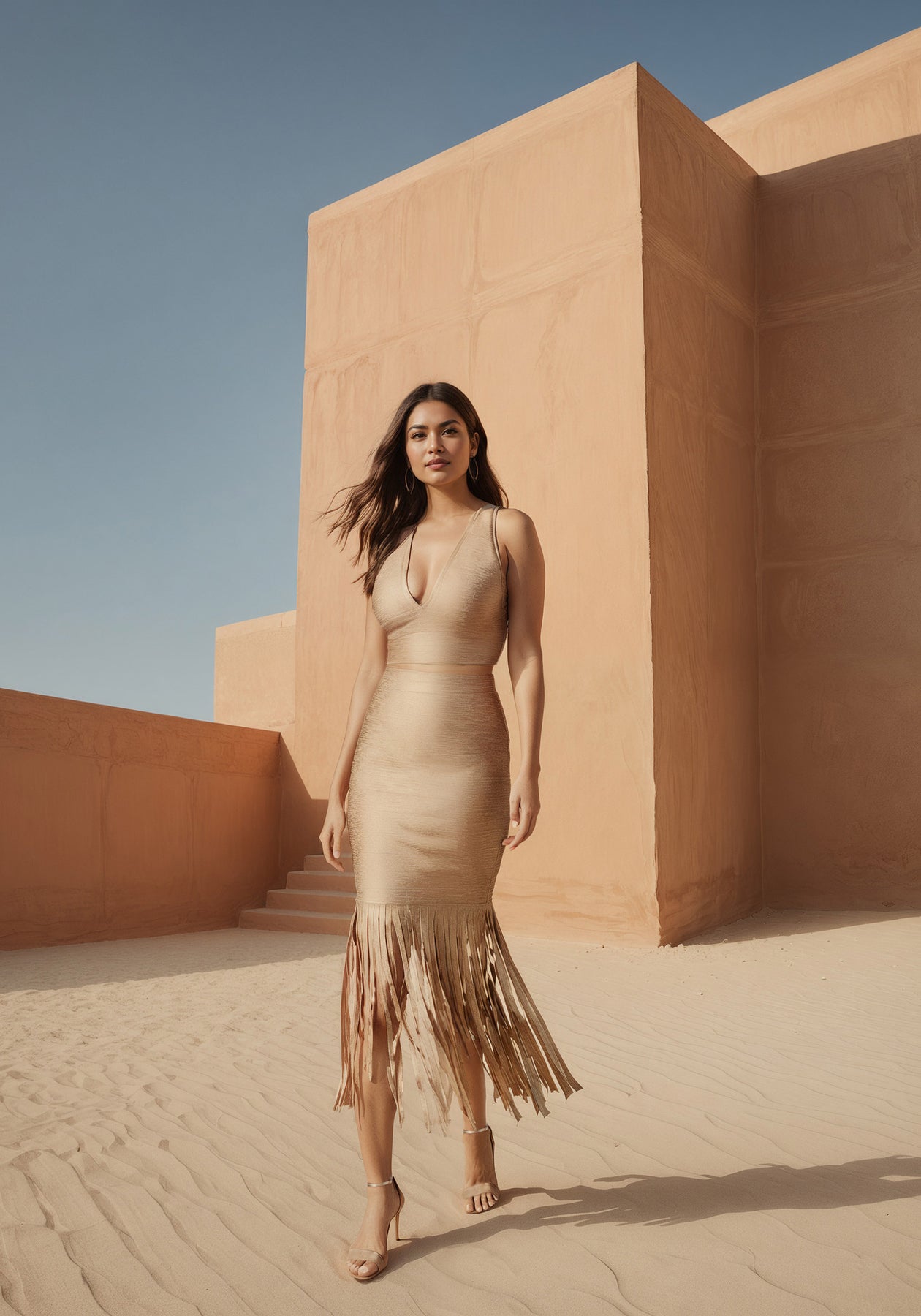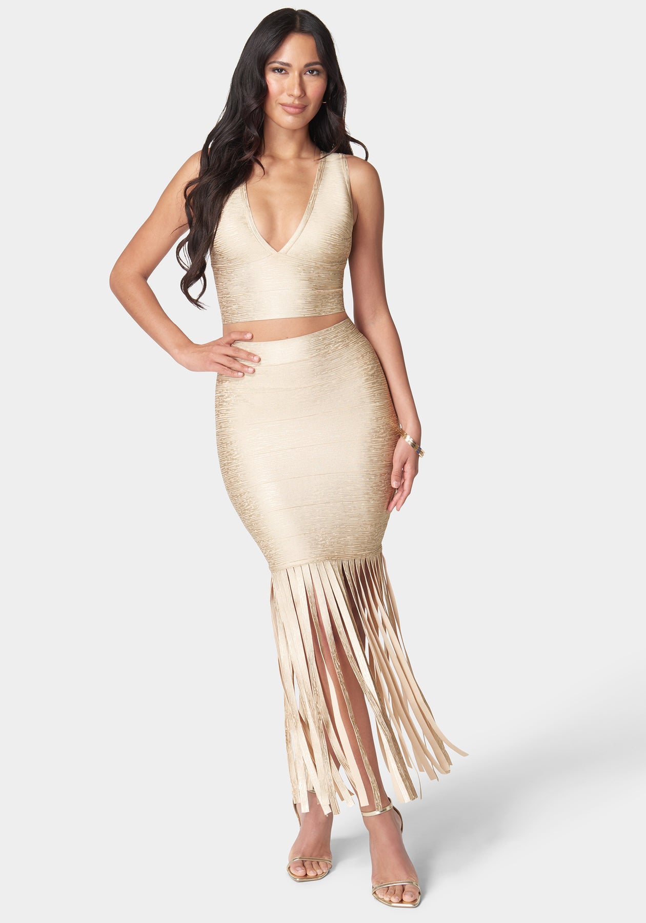 Unleash your inner diva in this shimmering two-piece fringe set. The bandage fabric hugs your curves in all the right places, while the eye-catching foil detail adds a touch of allure. Get ready to make a statement on the dance floor or at a special event.