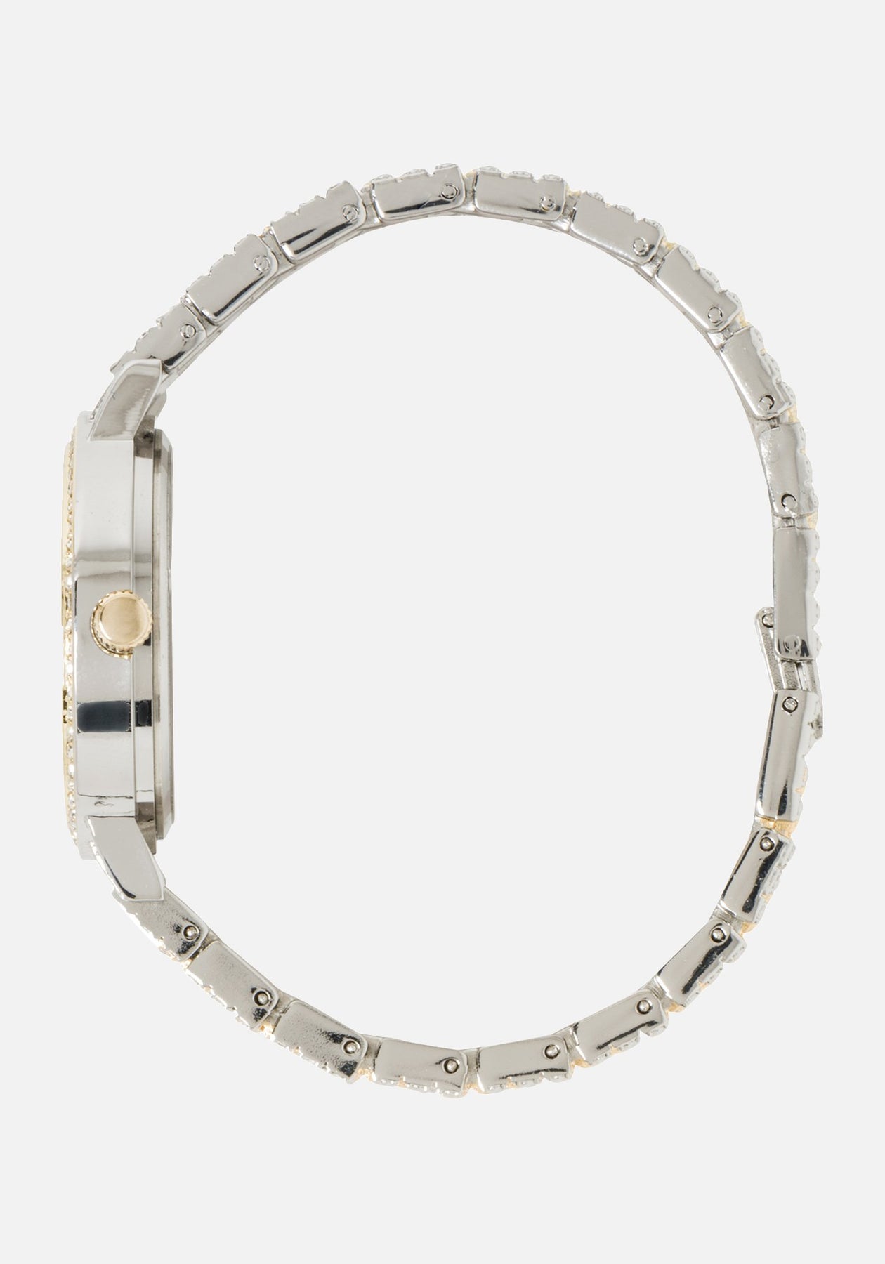 Two tone means more versatile. Mix metals and pair this essential watch with anything. Features a silver and gold band, a round face, and cystals.