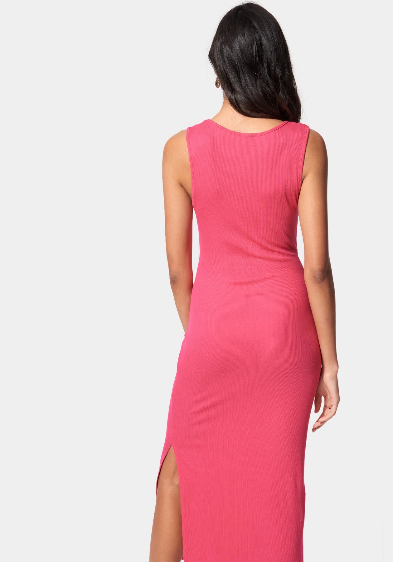 Finished with the iconic rhinestone logo and side slit hem, this ribbed knit dress is the perfect everyday casual look.