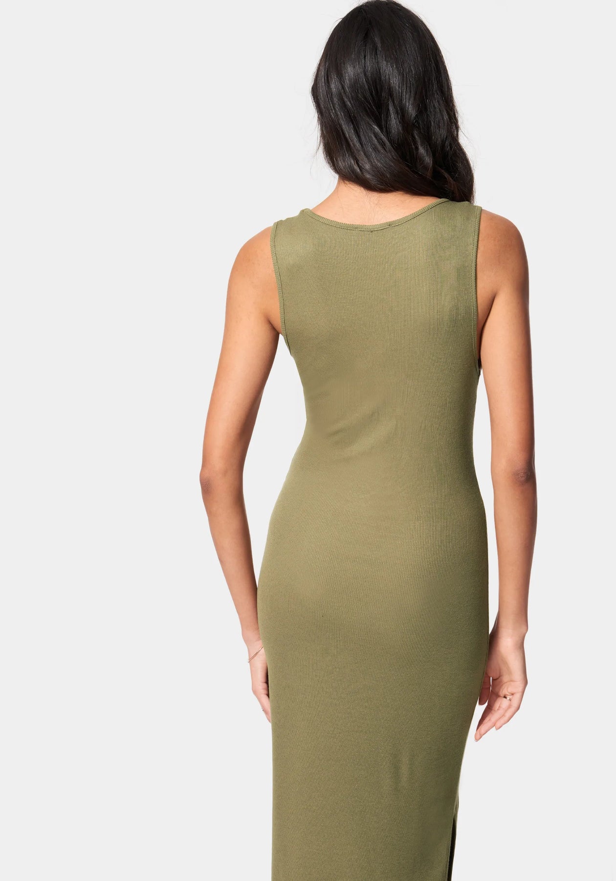 Finished with the iconic rhinestone logo and side slit hem, this ribbed knit dress is the perfect everyday casual look.