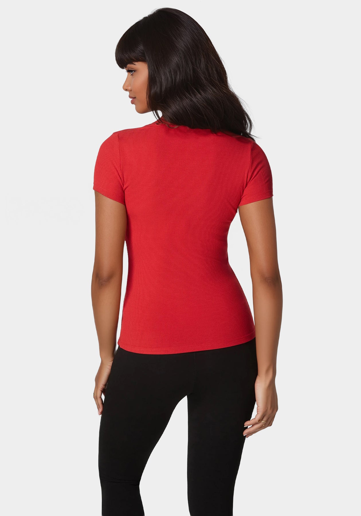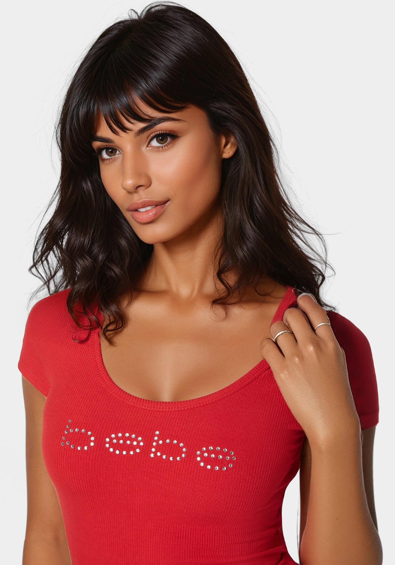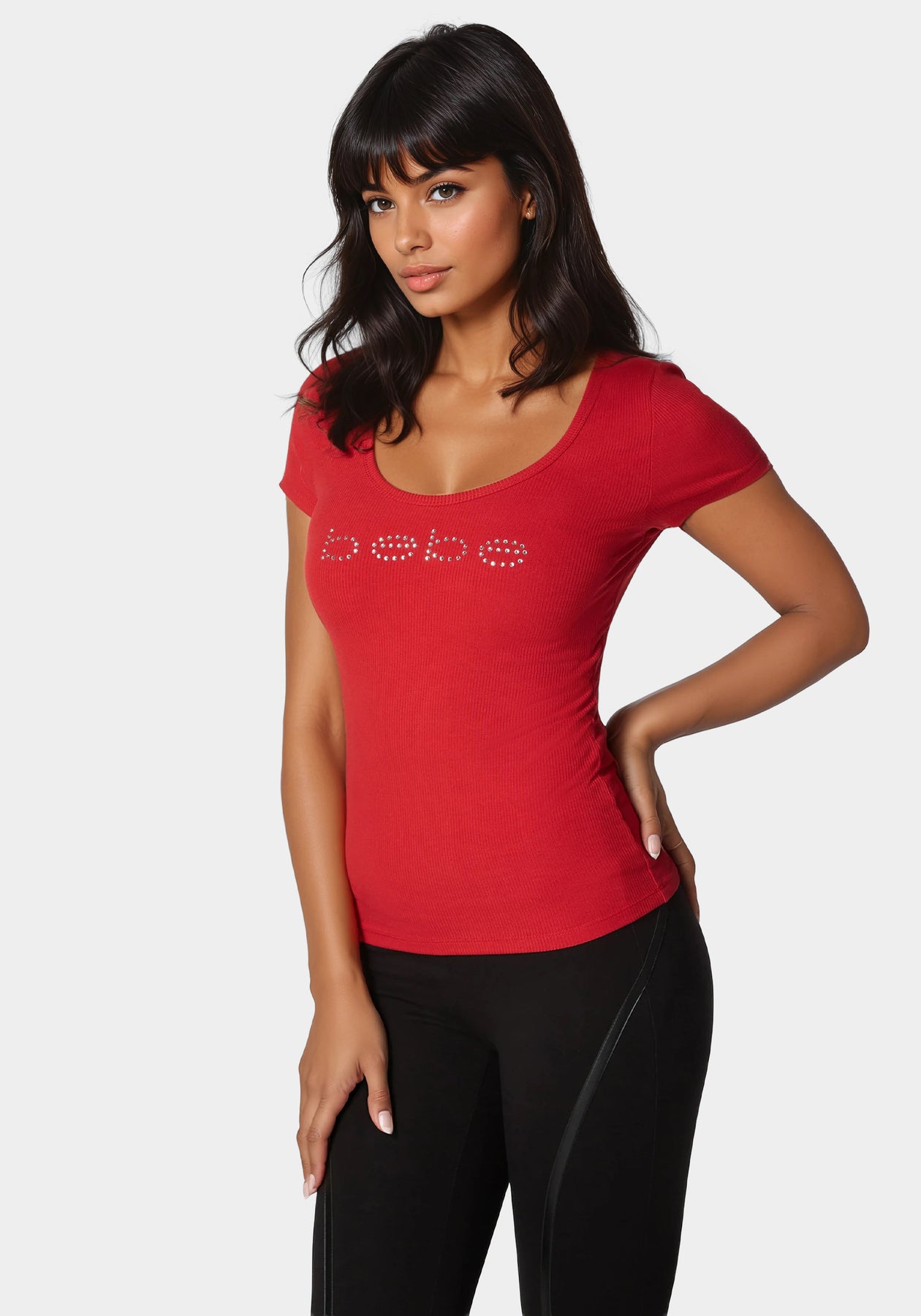 Bebe Logo Short Sleeve Scoop Neck Single Stone Rib Top