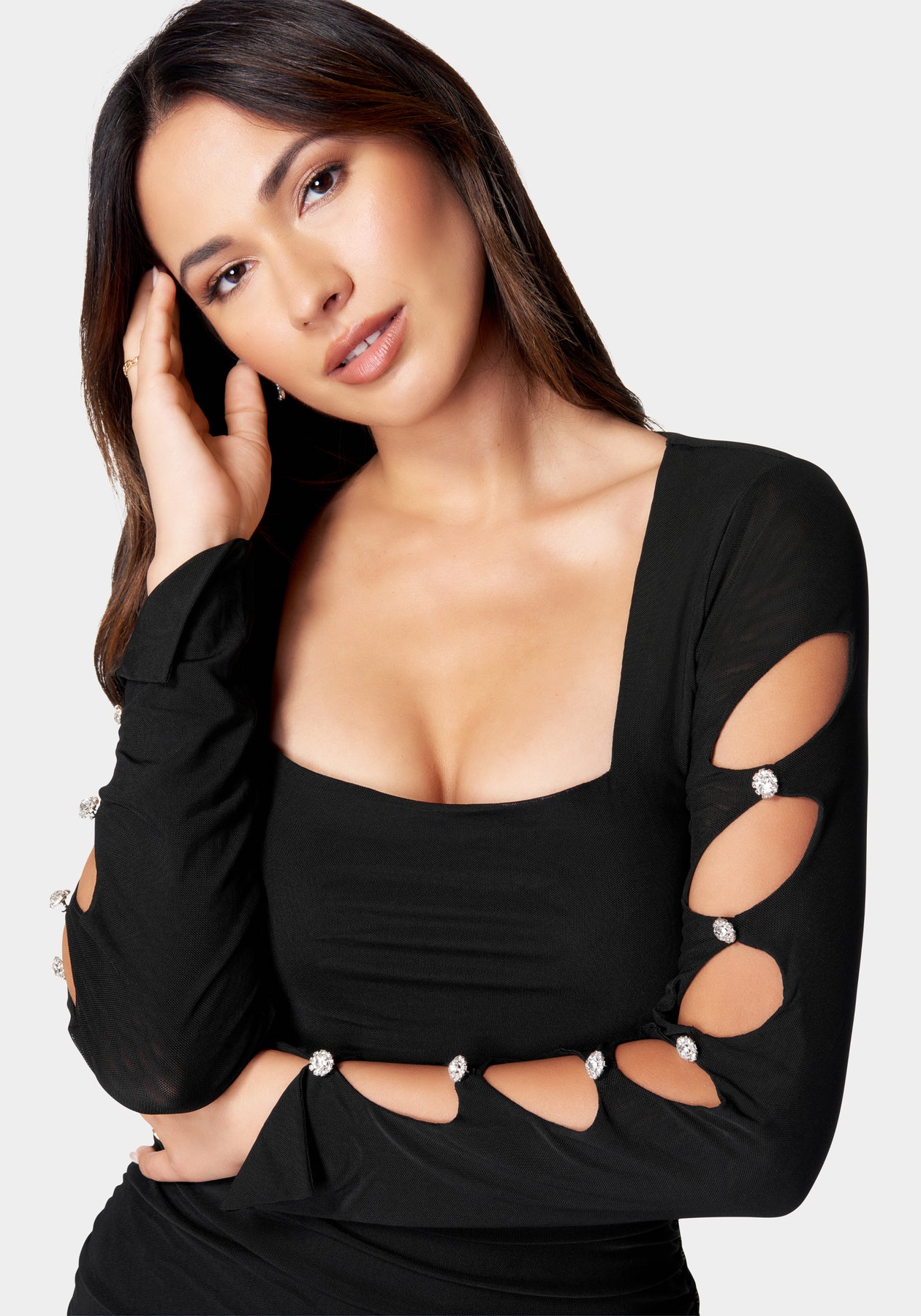 A button detail mini club dress is the perfect outfit for a fun night out. This dress showcases an edgy and trendy design with distinct button details that add visual interest. Its mini length offers a playful appeal that's ideal for a club setting.