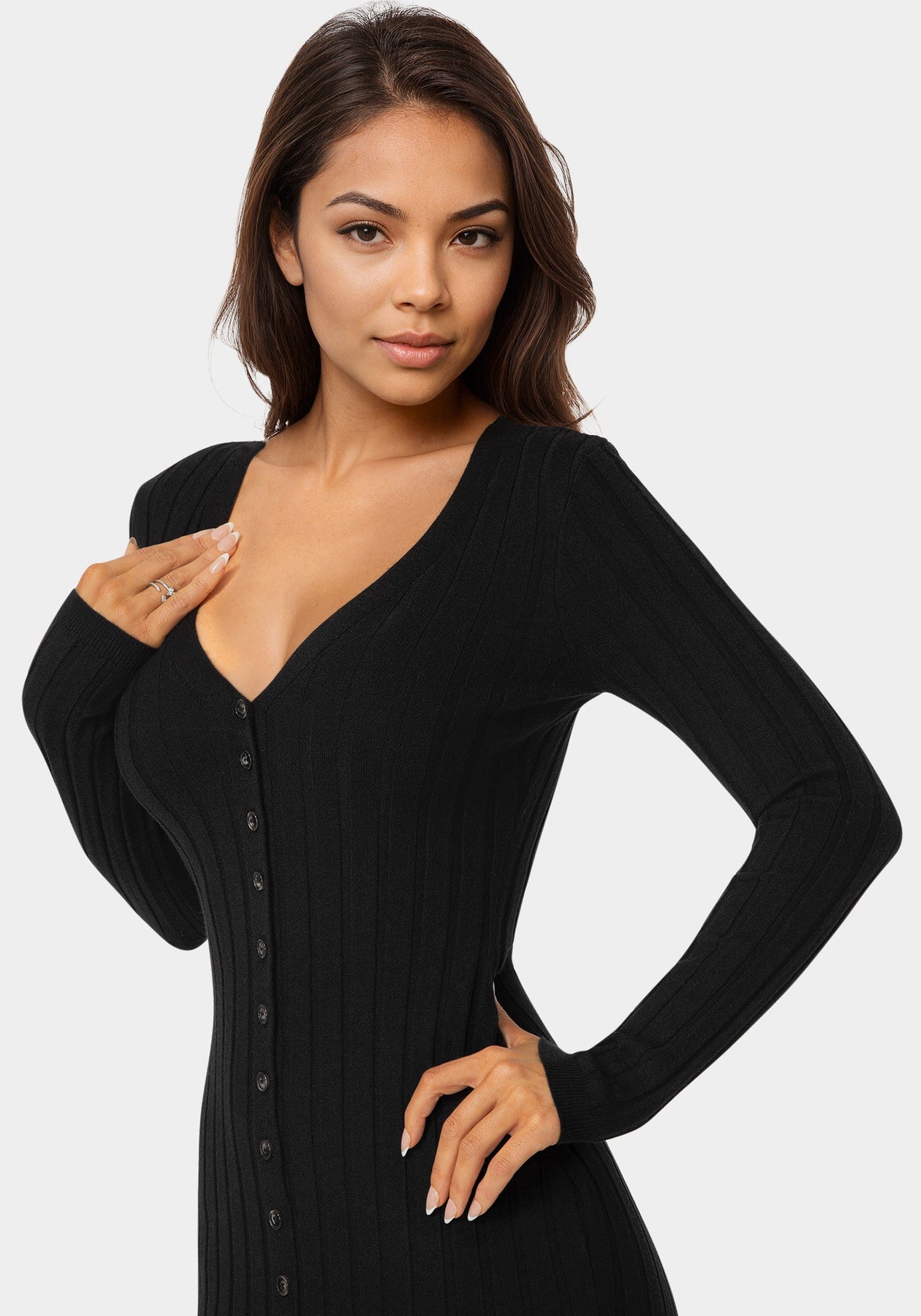 Side View-Button Front V-Neck Sweater Midi Dress-BLACK