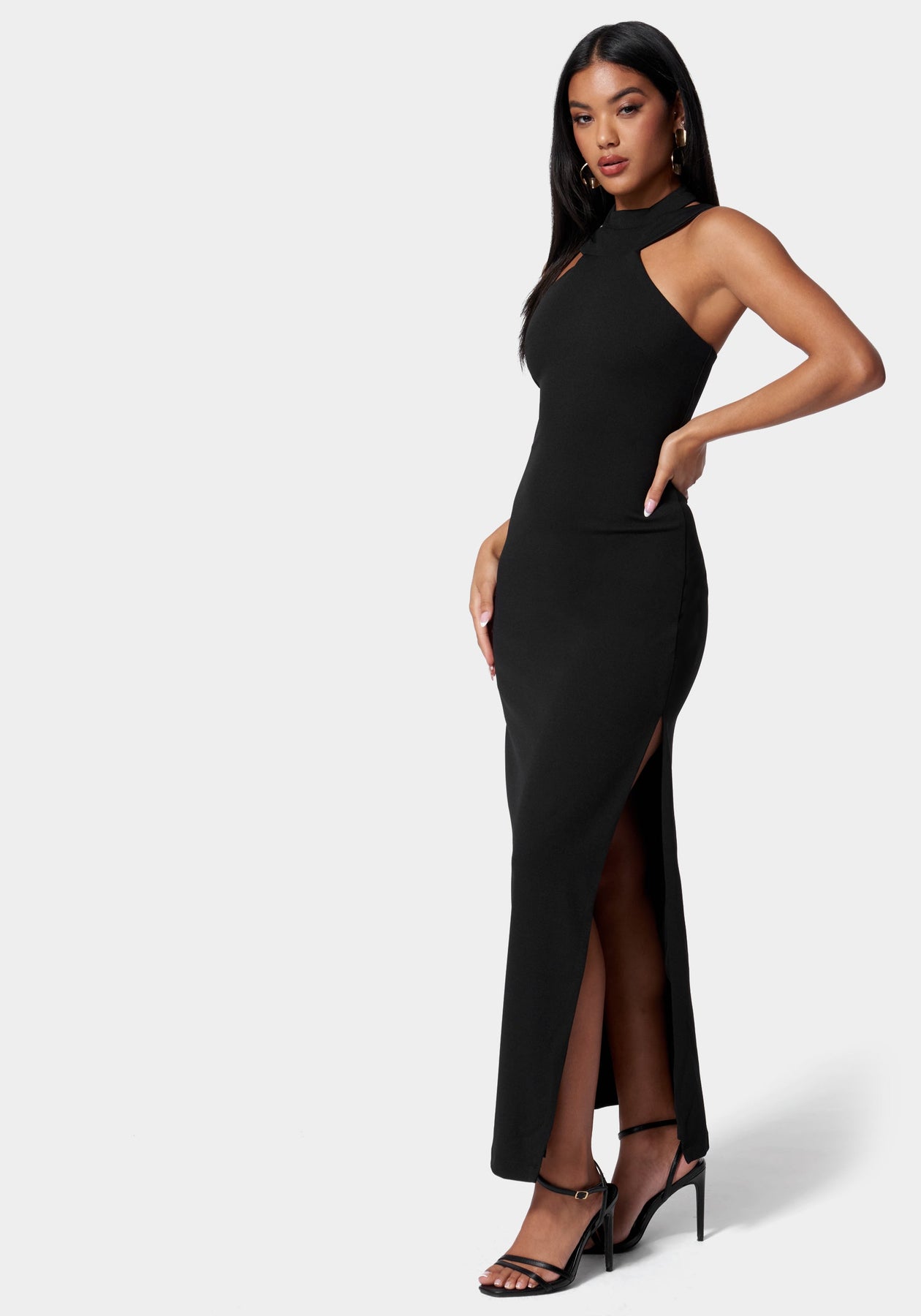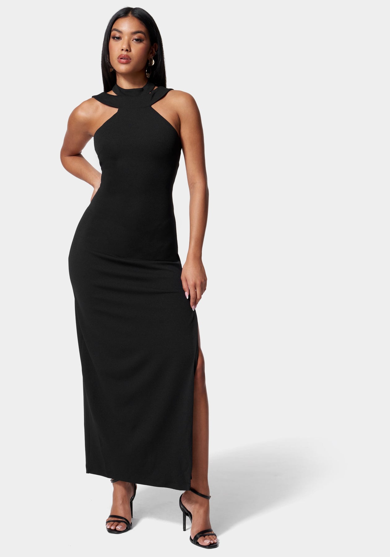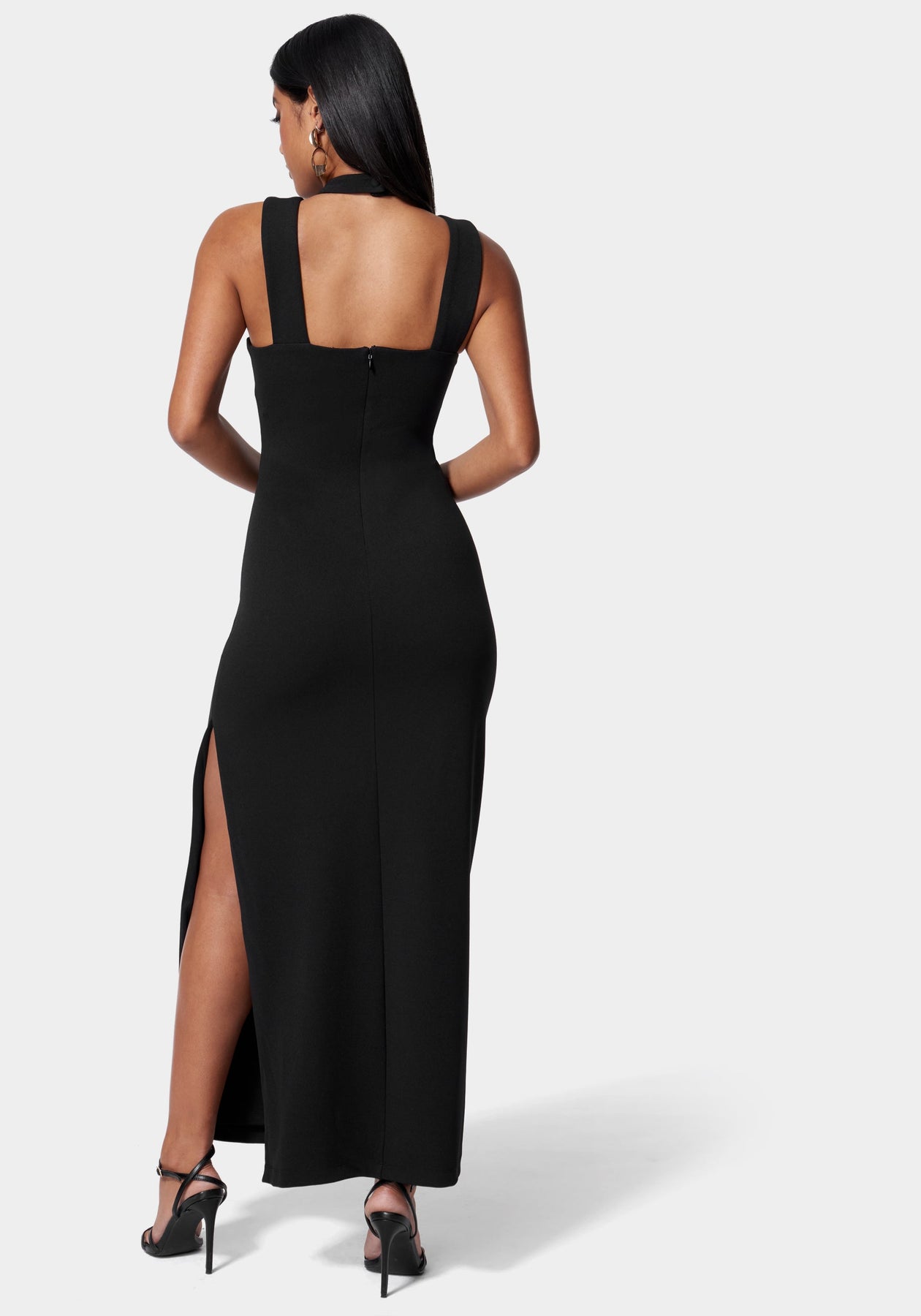 Soft elegance. This bandage maxi gown features a cutout choker neck design, side slit, and a concealed back zipper.
