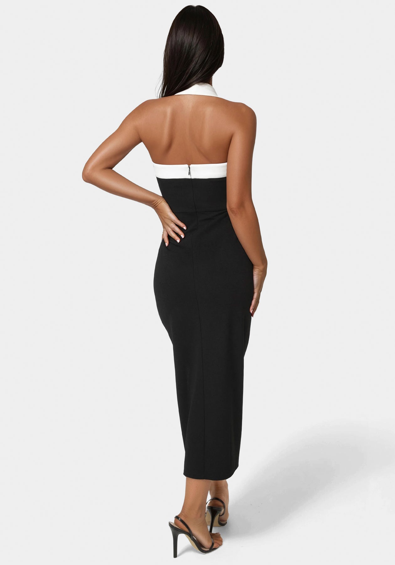 Colorblock halter neck midi that frames shoulders and skims curves. Wear to cocktail hour, gallery openings, and date nights.