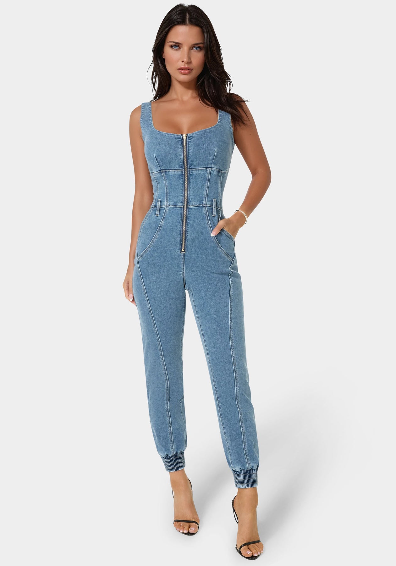 Comfort meets style with a corset design in this jogger denim jumpsuit; great for laid-back days or casual nights.