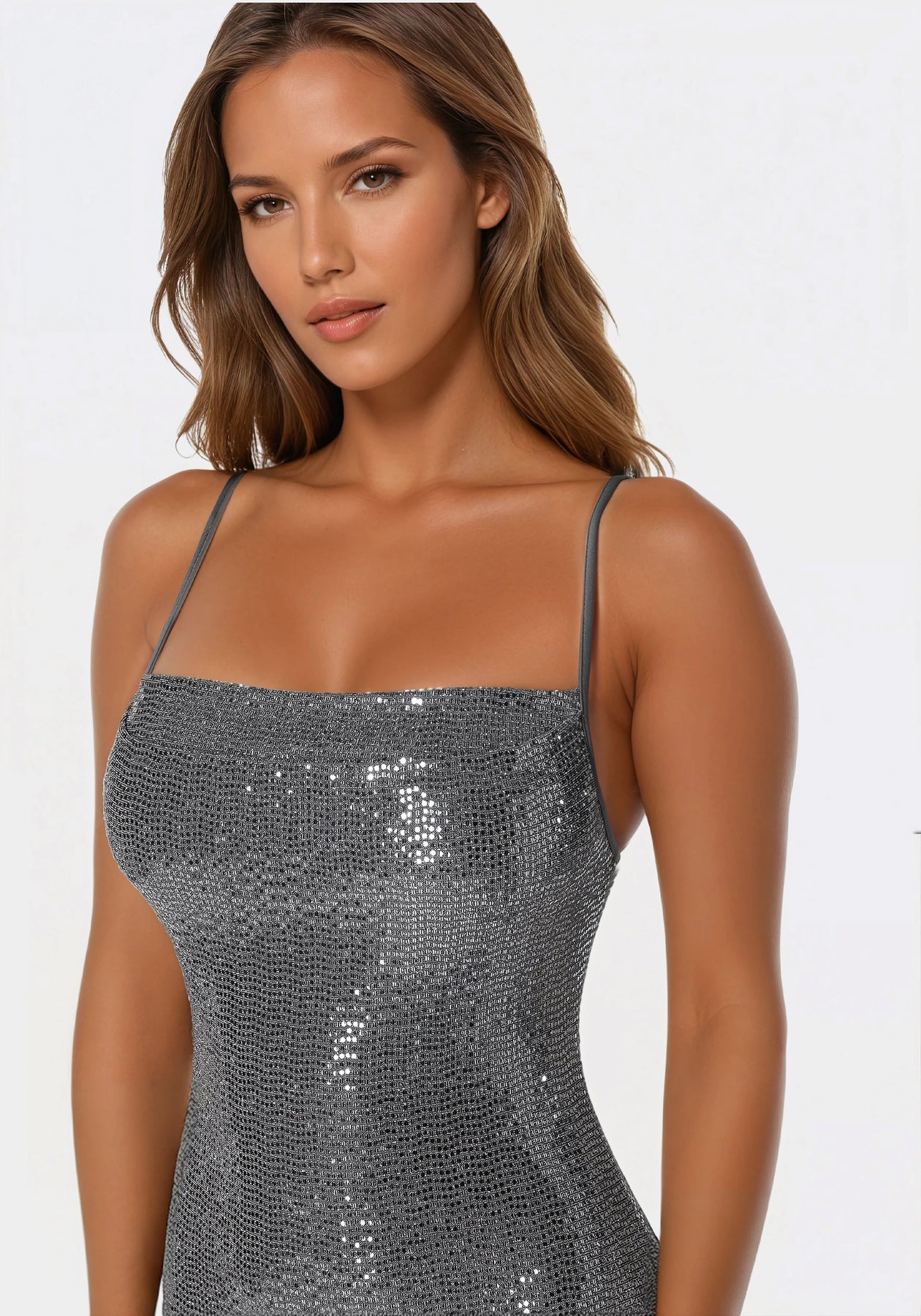 Illuminate your look with our cowl neck shimmer maxi dress. The dress features a shimmering fabric that catches the light beautifully, while the cowl neck adds an air of sophistication. The maxi length ties the ensemble together, giving it a hint of elegance and refinement. Ideal for events that require a bit of sparkle and class.