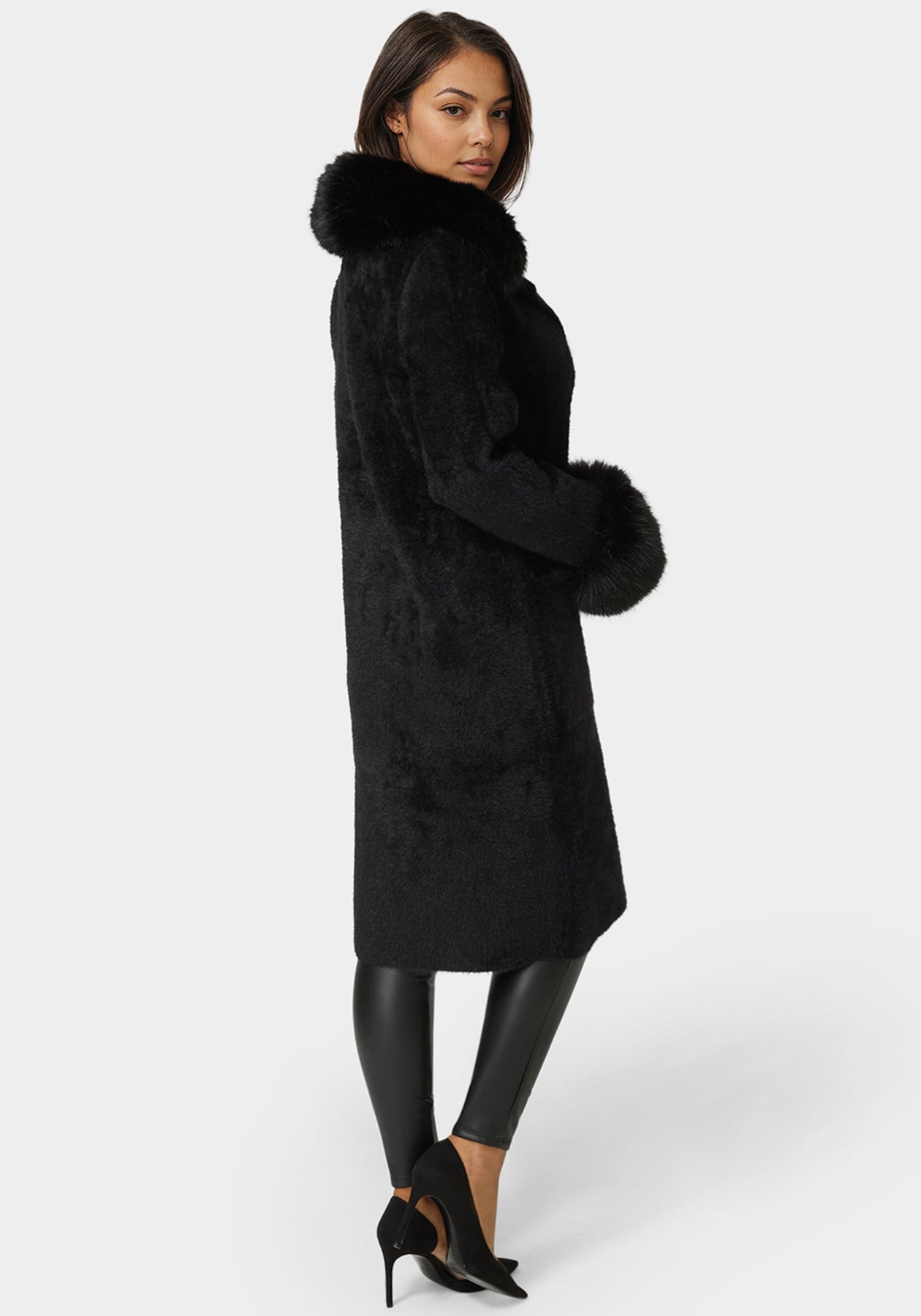 This stretch coat combines removable fur details with hidden front snaps for cozy yet polished winter evenings or dinner outings.
