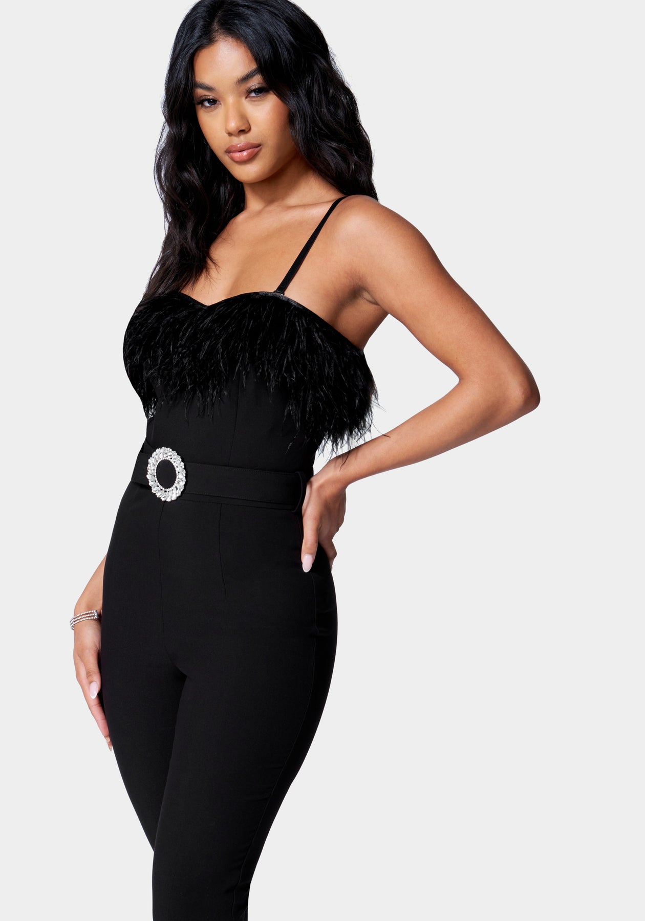Feather Trim Slim Leg Belted Jumpsuit
