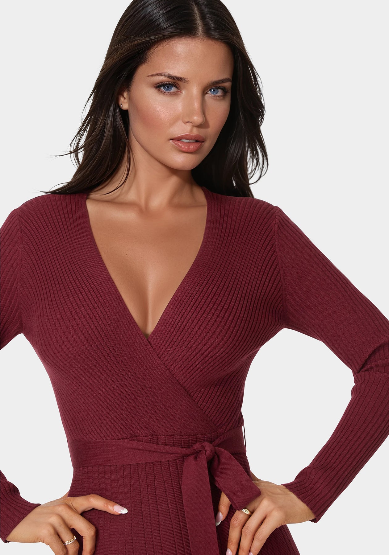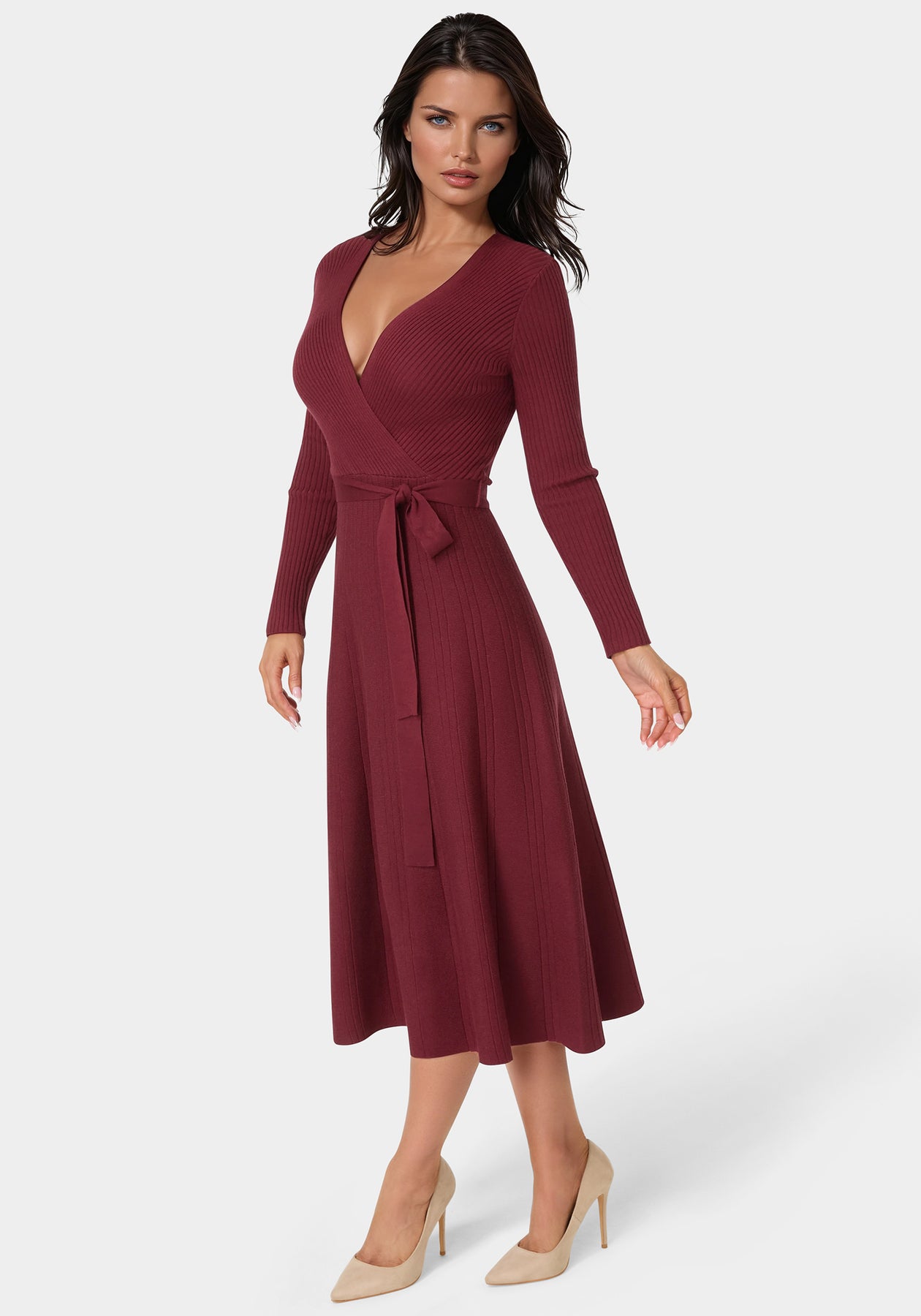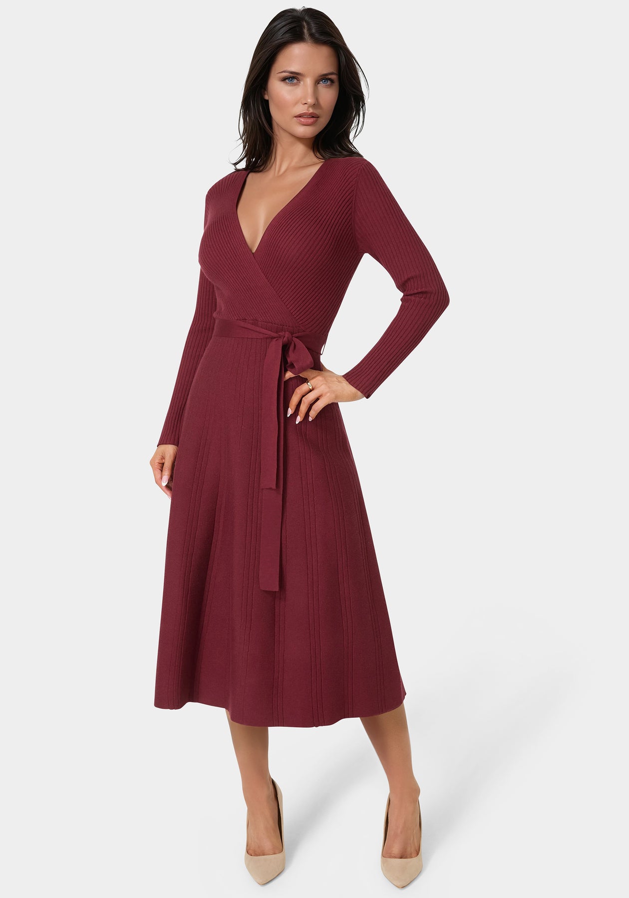 Long-sleeve knit midi with a flattering fit-and-flare silhouette; designed for cozy café moments or relaxed gatherings.
