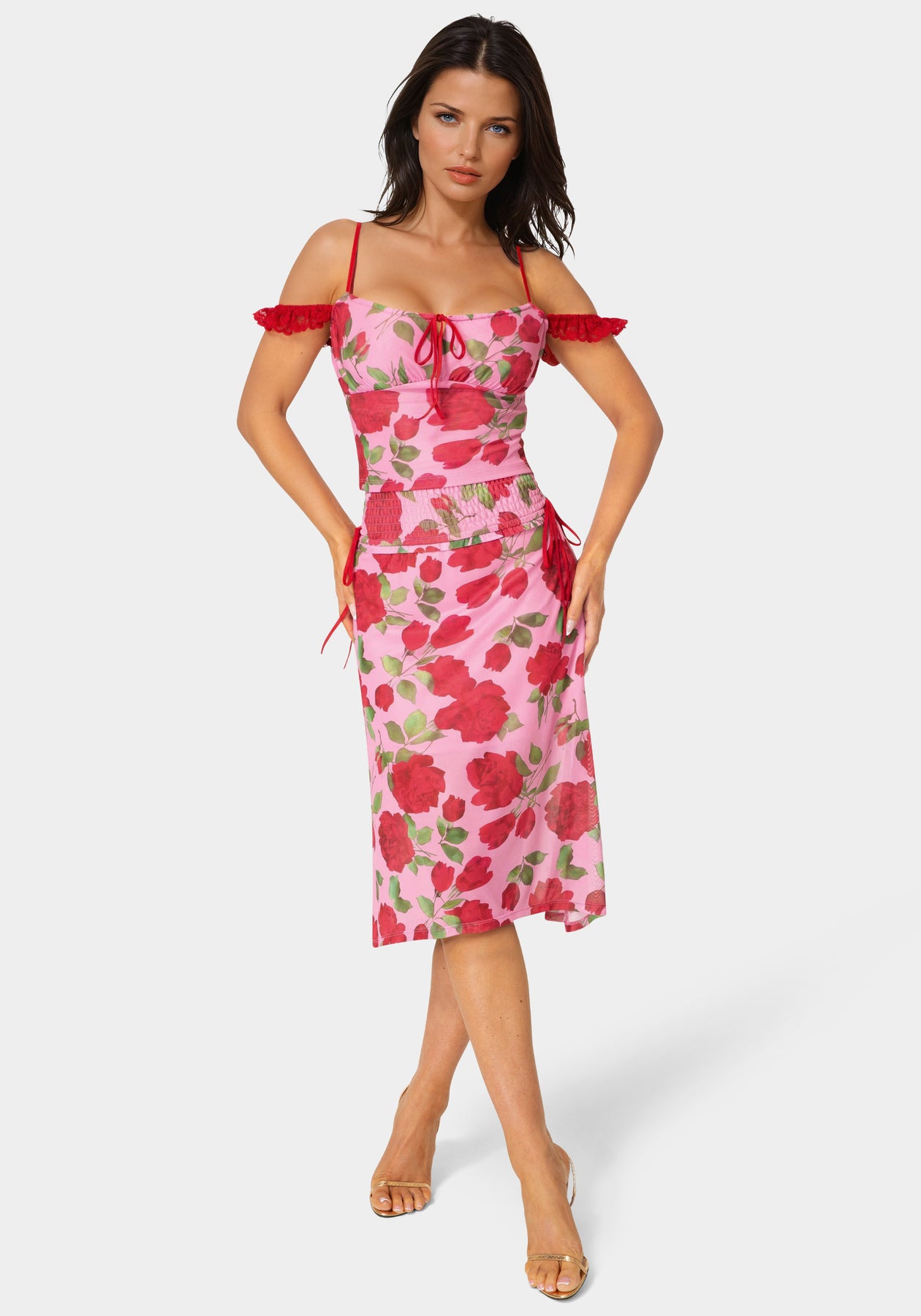 Floral printed mesh maxi skirt with a comfy elastic waist, adjustable side ties, and full lining. Pair with a bikini top on vacation, or a fitted tee for brunch and errands.