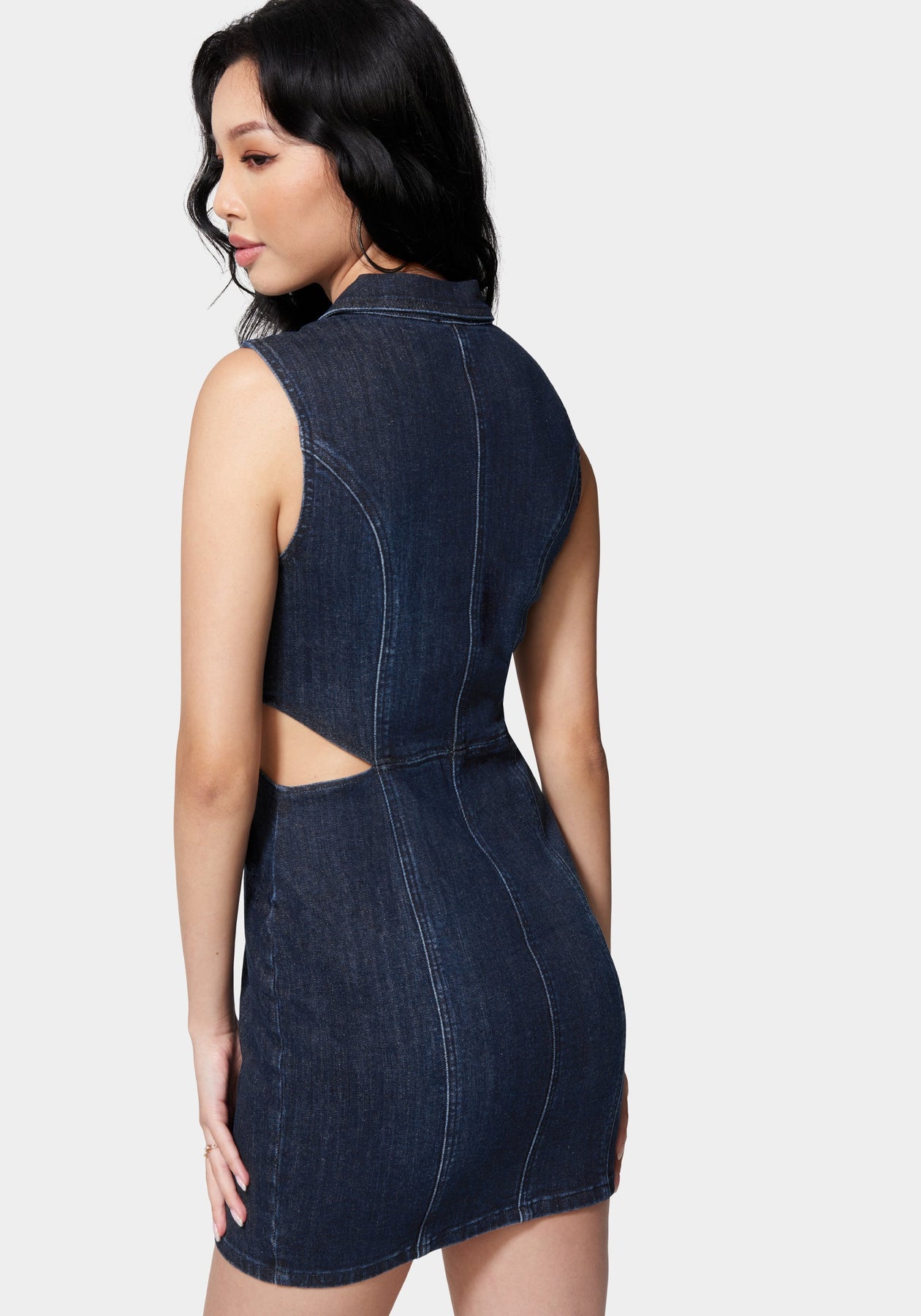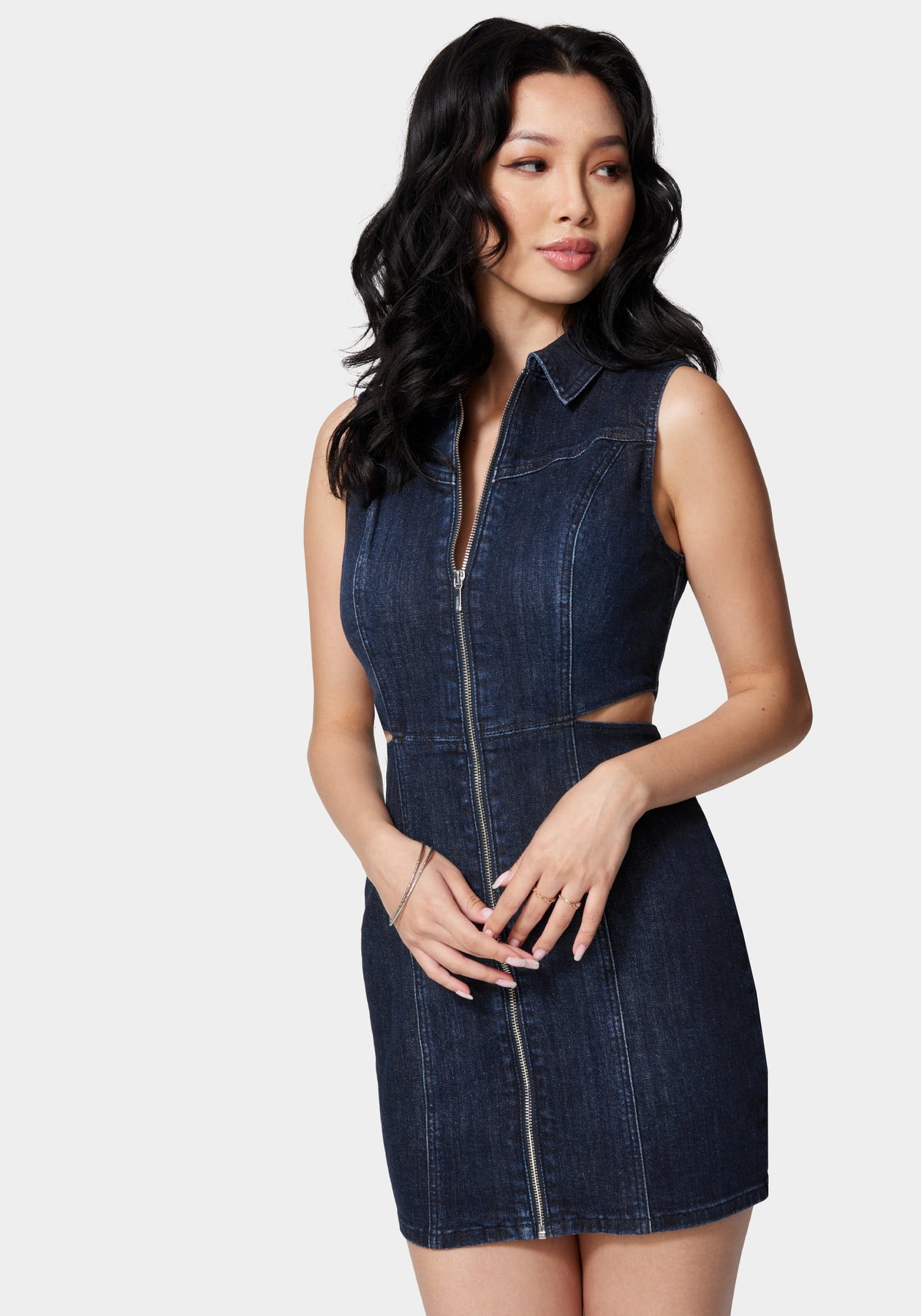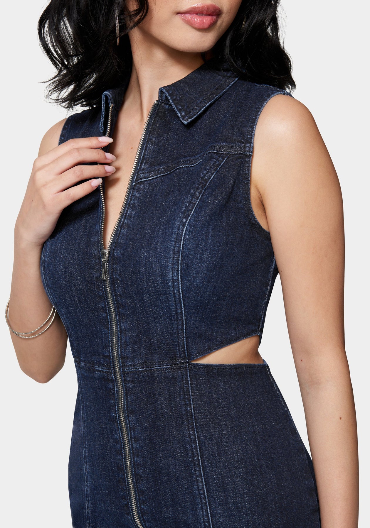 Designed in comfy stretch denim, this sleeveless mini dress features side cutouts at the waistline, front zipper, shirt collar, and a bodycon silhouette that flatters you. Dress it up or down for a weekend outing.