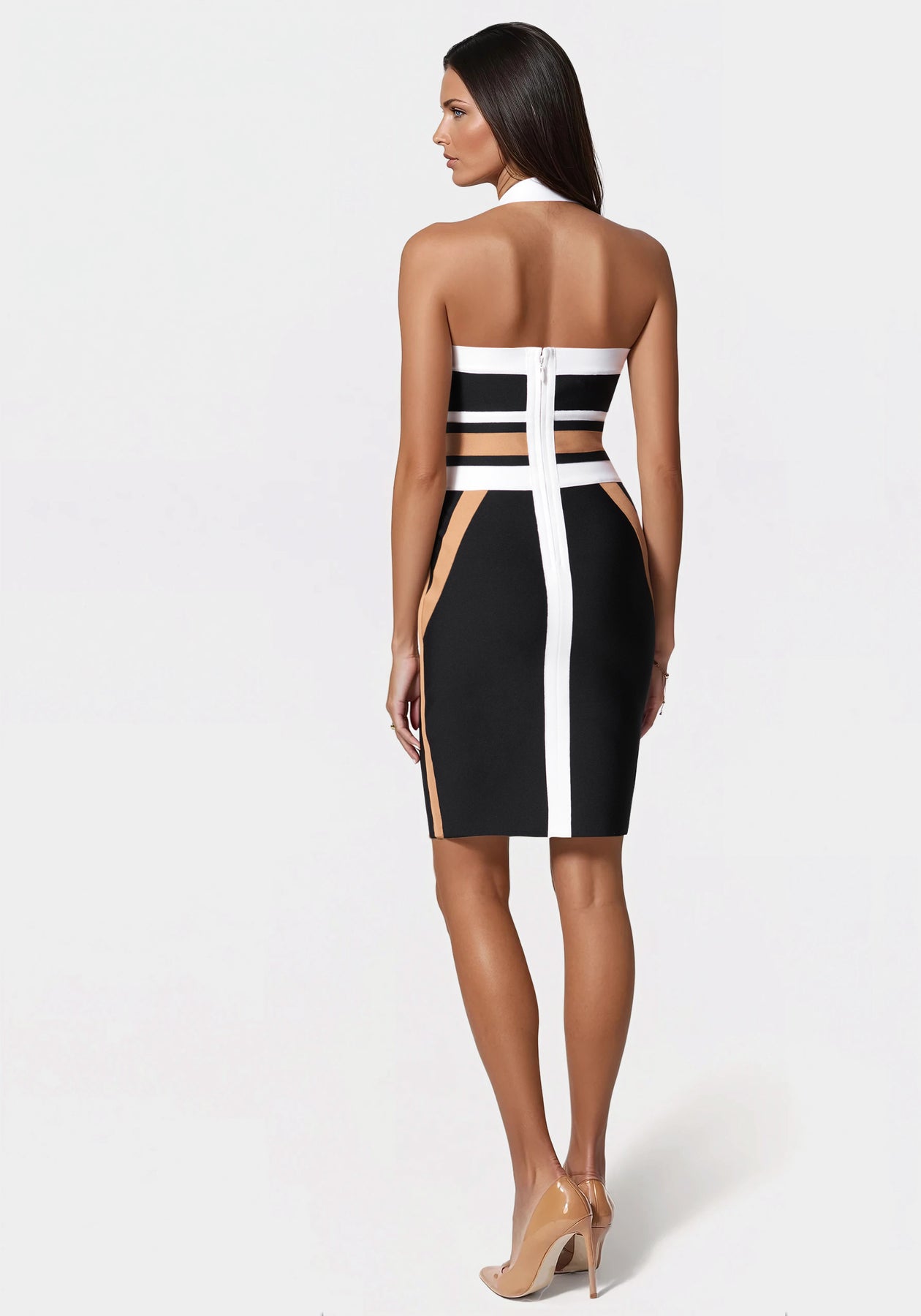 This dress's bandage design contours perfectly to your body, highlighting your figure with its halter neckline and form-fitting silhouette.