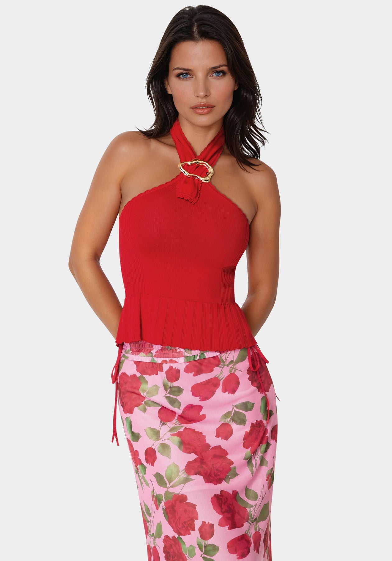 Halter neck ribbed-knit top in stretchy, body-hugging texture with a hint of gold hardware. Pair with wide leg jeans for brunch, mini skirts for dates, and blazers for work-ish.