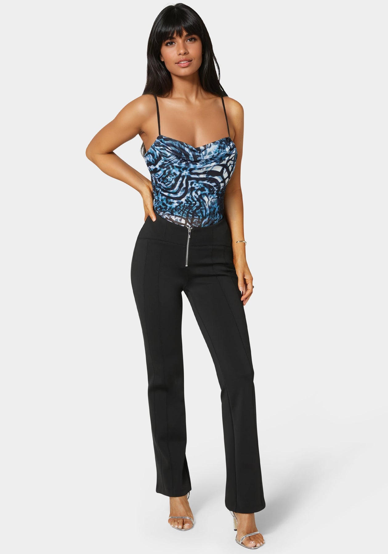 High-waist flared pants with stretch fabric and metal zipper detail, ideal for workday styling or casual night outings.