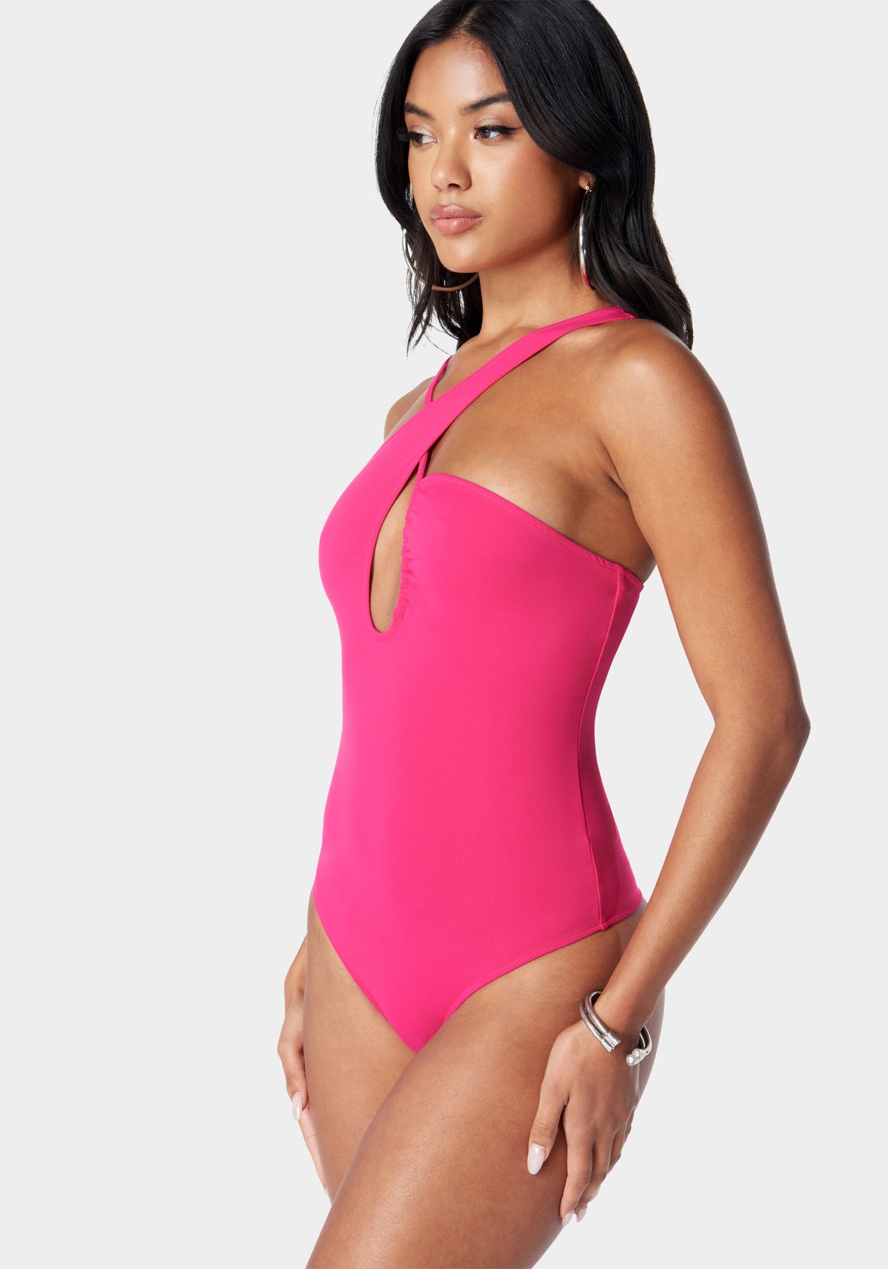 A vibrant pink bodysuit features an on-trend keyhole detail. The halter straps feature asymmetrical sizes for an enticing look. Perfect for the club or weekend plans.