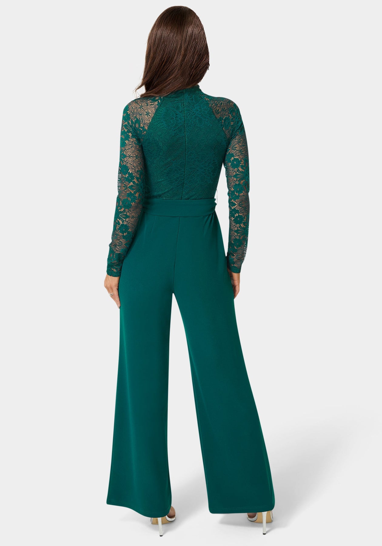 This jumpsuit features a lace bodice, tie belt, and sleek straight legs. The long sleeve design makes it perfect for formal gatherings, weddings, or evening occasions.