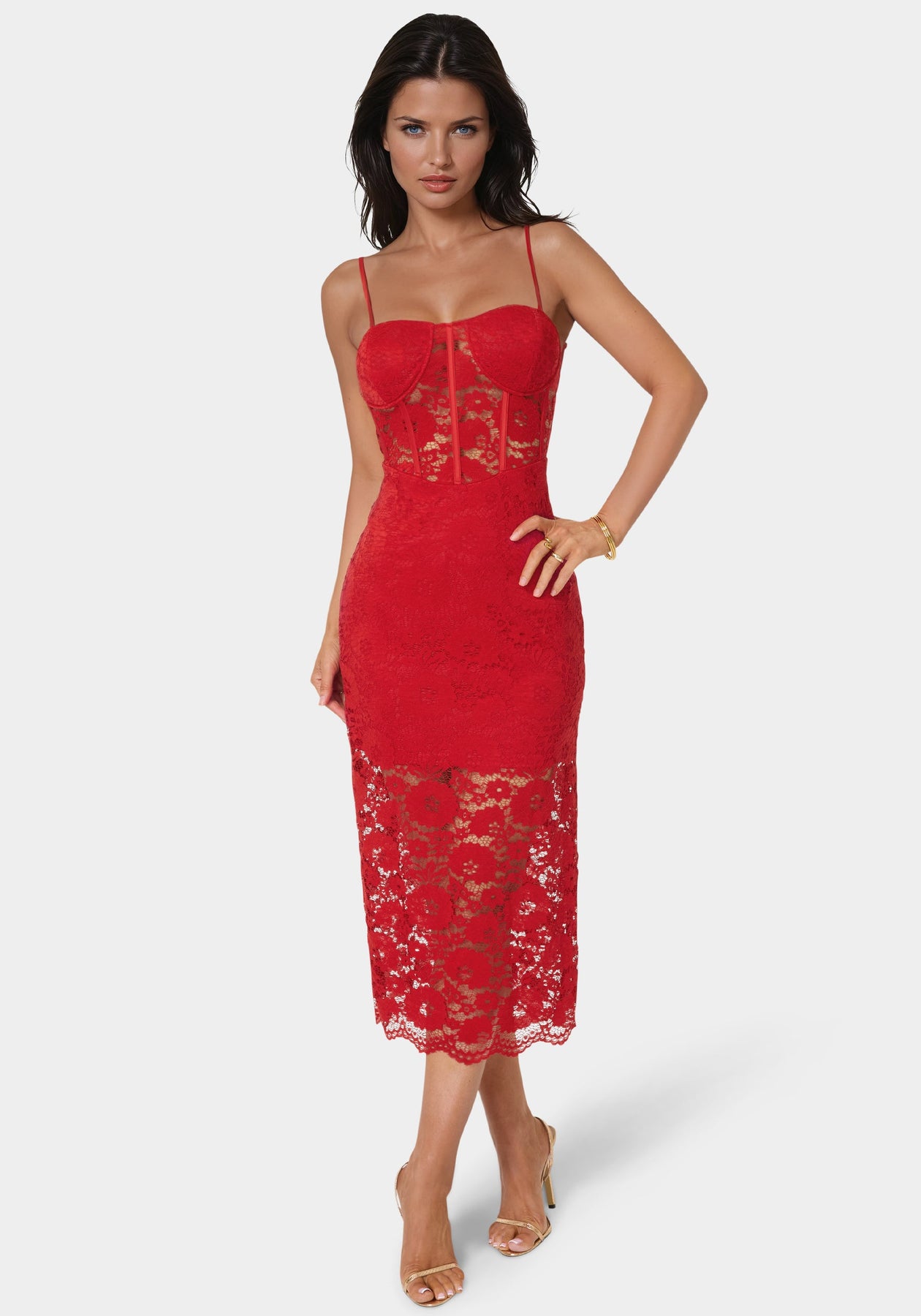 This sleeveless midi dress with a structured lace corset top is perfect for date nights, weddings, or formal events, making it an elegant choice for capturing attention.