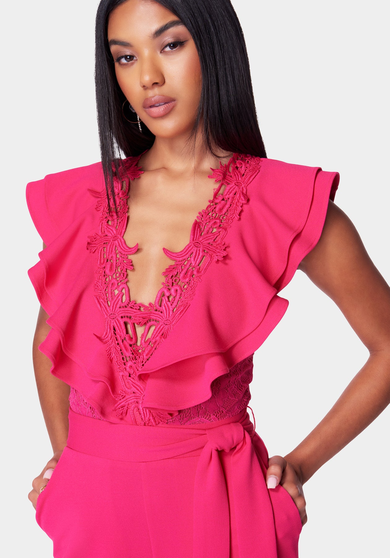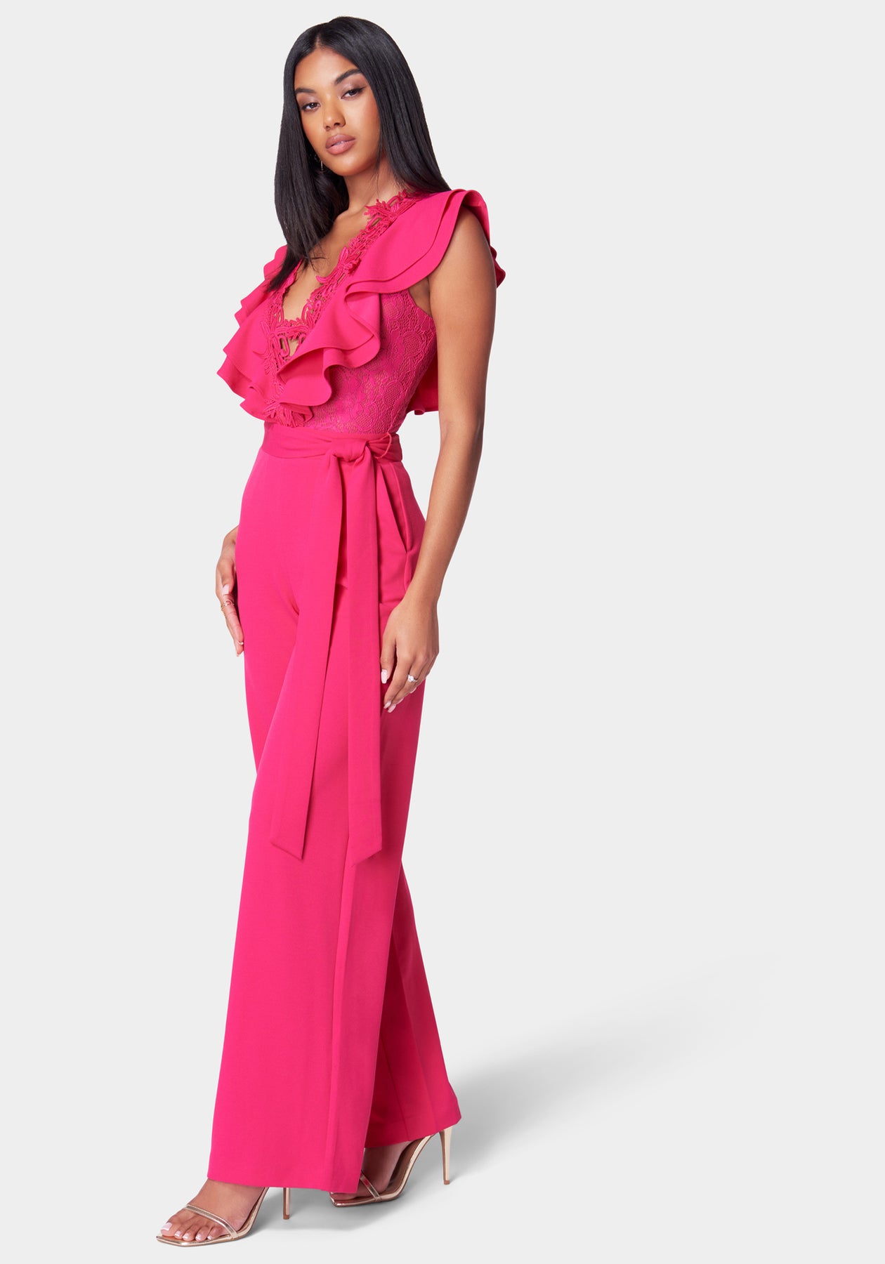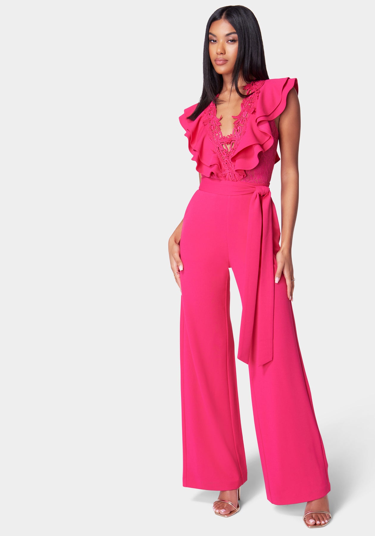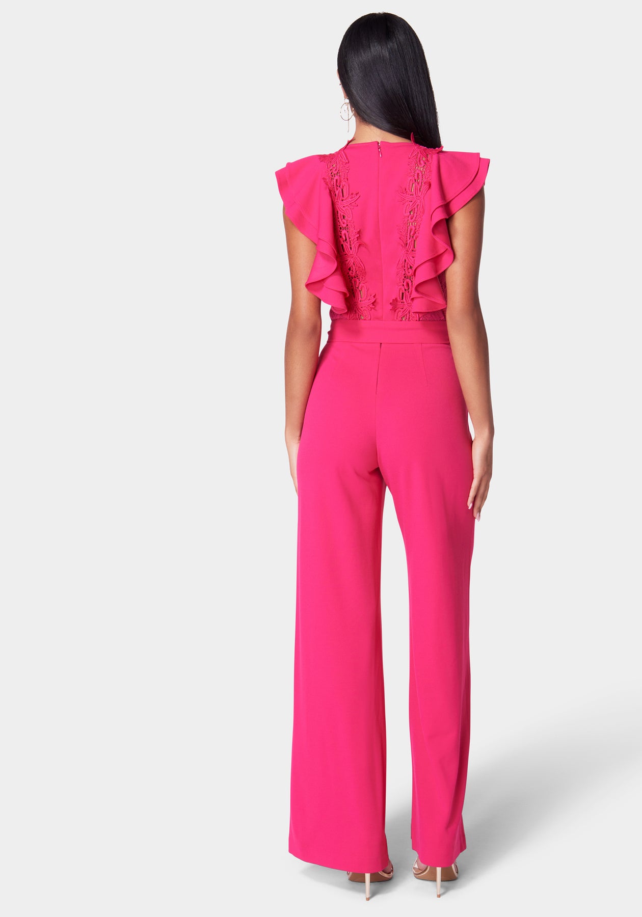 Command the room with the lace trim knit crepe palazzo jumpsuit. Its flowing palazzo-style legs create a beautifully balanced silhouette, while the delicate lace trim adds a touch of soft, romantic detail. Made with comfortable knit crepe, this jumpsuit doesn't compromise on comfort for style.
