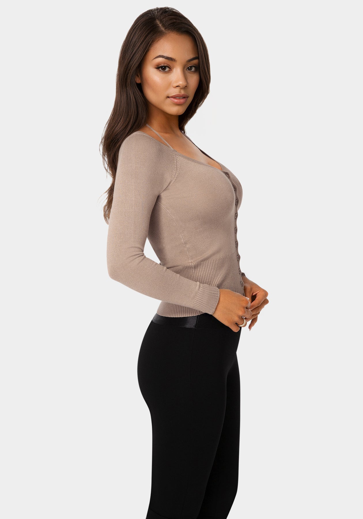 Side view - Light Weight Halter Neck Tie Cardigan - Bare Affair