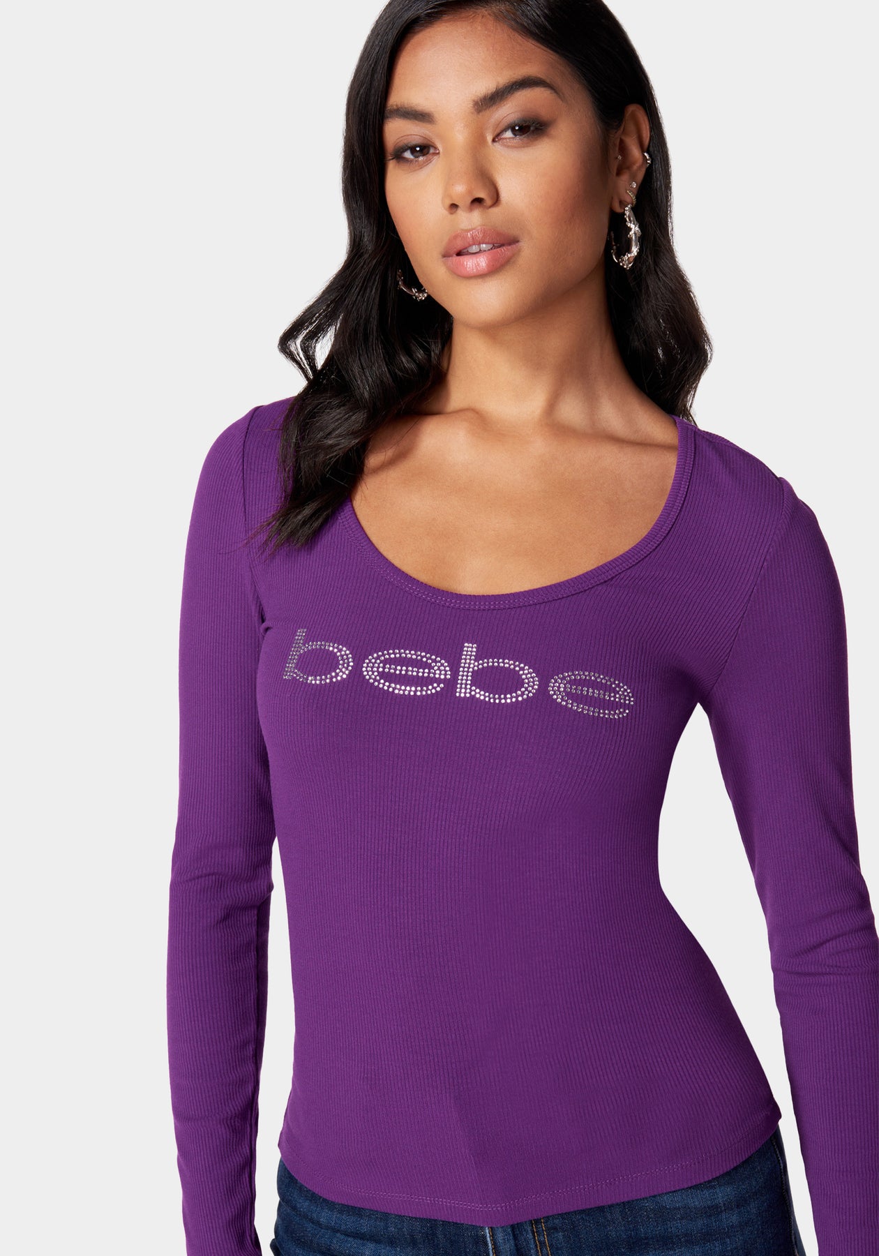 Boost your casual style with our long sleeve scoop neck bebe logo rib top. This top features long sleeves and a flattering scoop neck design. Adorned with the signature bebe logo, it carries a trendy vibe. Made from a ribbed fabric, it's soft, stretchy and promises all-day comfort. This versatile top pairs well with any item - from jeans to skirts, making it a must-have in your casual clothing collection.