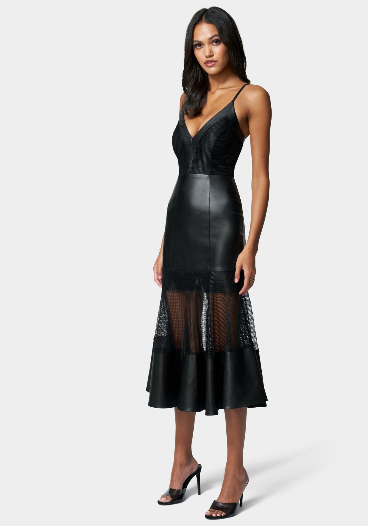 Rock and roll. This mixed media dress features vegan leather and mesh details along the skirt, complete with a plunging neckline, adjustable straps, and a hidden zipper closure for the perfect fit.