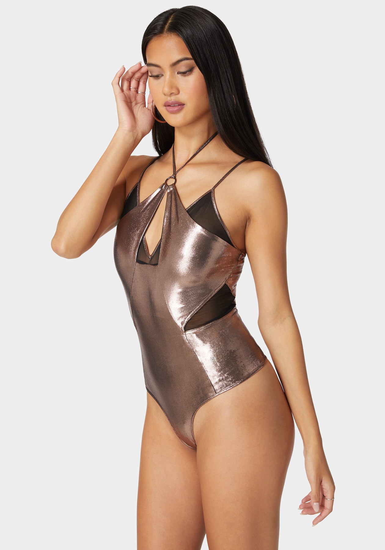 Step into luminous allure with the Metallic Foil Halter Neck Mesh Combo Bodysuit. This piece is a dance between daring and delight, featuring a halter neck that bares with confidence and a metallic foil that catches every eye. Mesh detailing whispers secrets of what's beneath, making this bodysuit a key to unlocking nights filled with intrigue and empowerment.